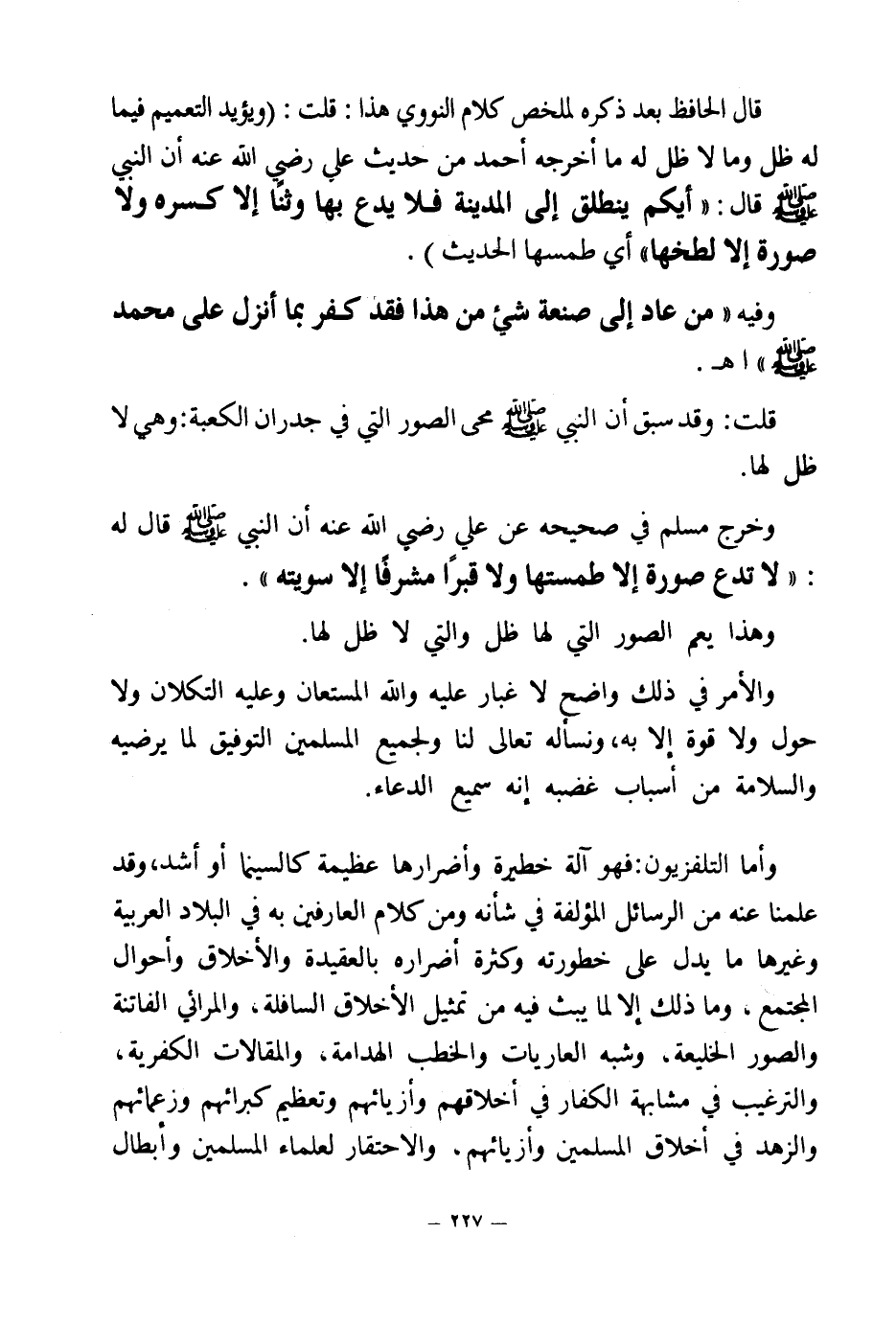 وأما التلفزيون فهو آلة خطيرة وأضرارها عظيمة كالسينما أو أشد، وقد علمنا عنه من الرسائل المؤلفة في شأنه ومن كلام العارفين به في البلاد العربية وغيرها ما يدل على خطورته وكثرة أضراره بالعقيدة والأخلاق وأحوال المجتمع، وما ذلك إلا لما يبث فيه من تمثيل الأخلاق السافلة، والمرائي الفاتنة والصور الخليعة، وشبه العاريات والخطب الهدامة، والمقالات الكفرية، والترغيب في مشابهة الكفار في أخلاقهم وأزيائهم وتعظيم كبرائهم وزعمائهم والزهد في أخلاق المسلمين وأزيائهم، والاحتقار لعلماء المسلمين وأبطال