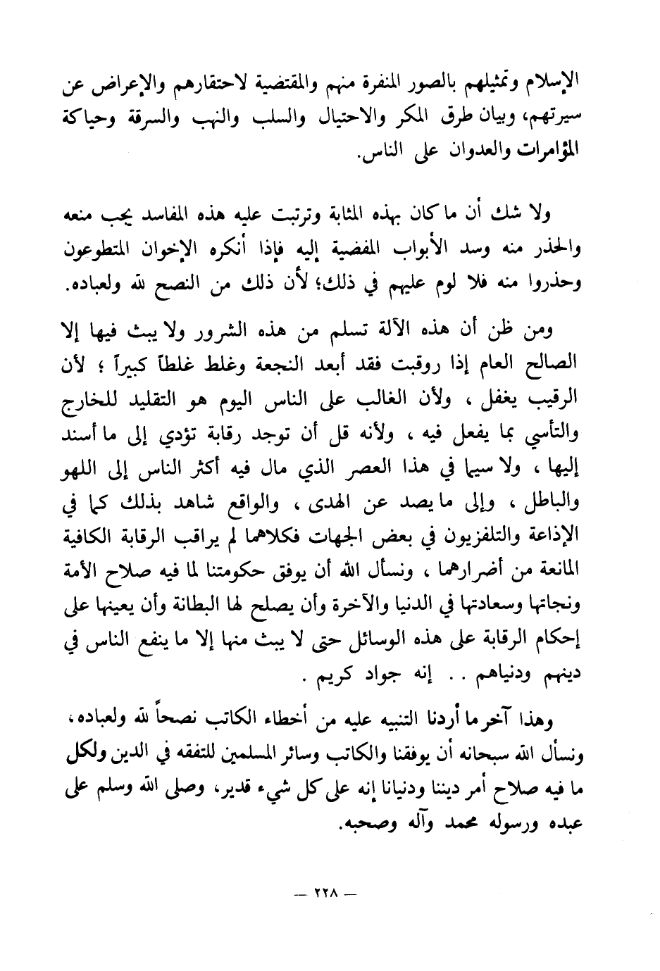 ومن ظن أن هذه الآلة تسلم من هذه الشرور ولا يبث فيها إلا الصالح العام إذا روقبت فقد أبعد النجعة وغلط غلطا كبيرا؛ لأن الرقيب يغفل، ولأن الغالب على الناس اليوم هو التقليد للخارج والتأسي بما يفعل فيه، ولأنه قل أن توجد رقابة تؤدي ما أسند إليها، ولا سيما في هذا العصر الذي مال فيه أكثر الناس إلى اللهو والباطل، وإلى ما يصد عن الهدى، والواقع شاهد بذلك كما في الإذاعة والتلفزيون في بعض الجهات فكلاهما لم يراقب الرقابة الكافية المانعة من أضرارهما، ونسأل الله أن يوفق حكومتنا لما فيه صلاح الأمة ونجاتها وسعادتها في الدنيا والآخرة وأن يصلح لها البطانة وأن يعينها على إحكام الرقابة على هذه الوسائل حتى لا يبث منها إلا ما ينفع الناس في دينهم ودنياهم. . إنه جواد كريم.
