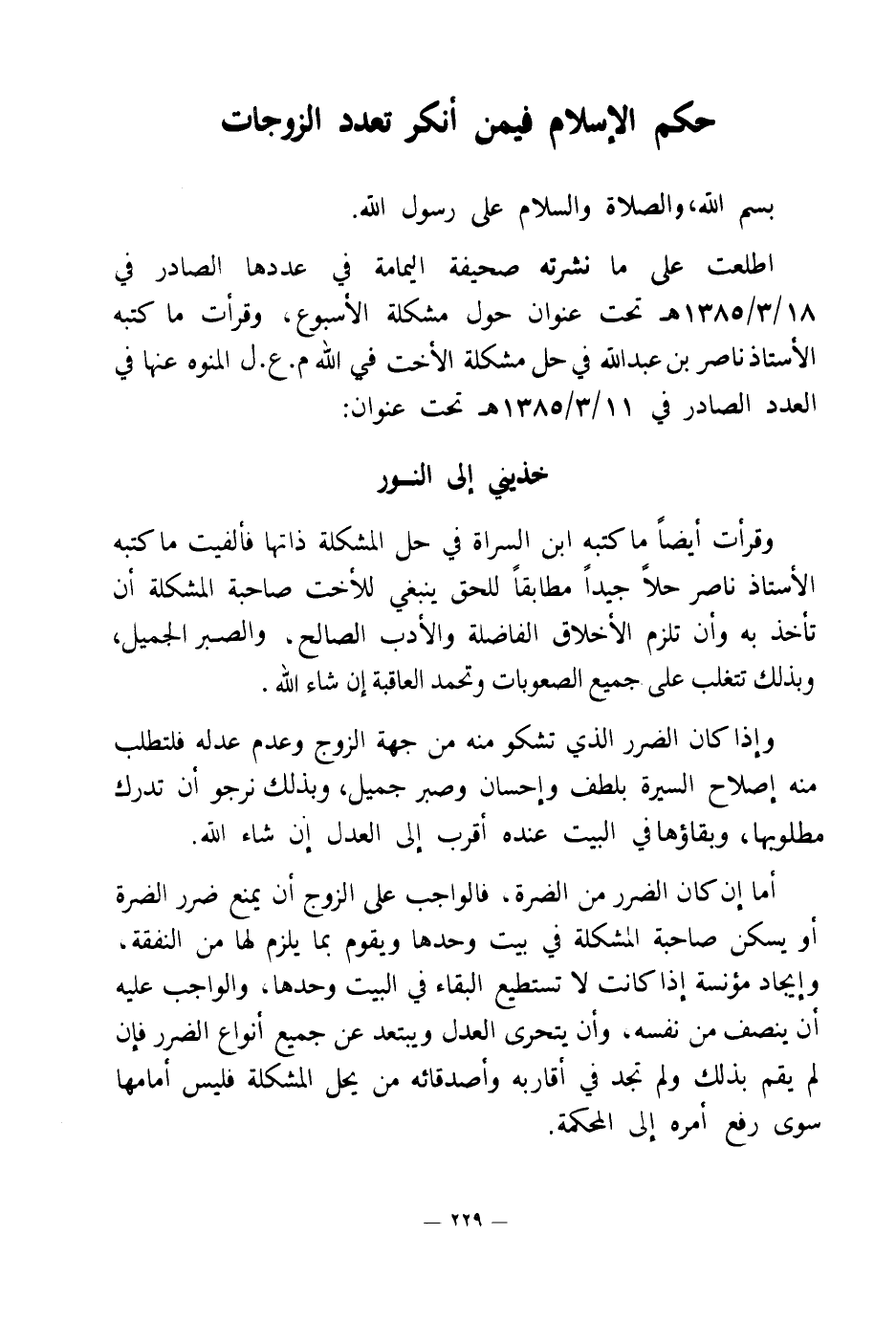 اطلعت على ما نشرته صحيفة اليمامة في عددها الصادر في 18 \ 3 \ 1385 هـ تحت عنوان حول مشكلة الأسبوع، وقرأت ما كتبه الأستاذ ناصر بن عبد الله في حل مشكلة الأخت في الله م ع ل المنوه عنها في العدد الصادر في 11 \ 3 \ 1385 هـ تحت عنوان: