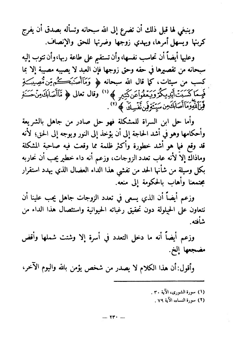 وأما حل ابن السراة للمشكلة فهو حل صادر من جاهل بالشريعة وأحكامها وهو في أشد الحاجة إلى أن يؤخذ إلى النور ويوجه إلى الحق؛ لأنه قد وقع فيما هو أشد خطورة وأكثر ظلمة مما وقعت فيه صاحبة المشكلة وما ذاك إلا لأنه عاب تعدد الزوجات. وزعم أنه داء خطير يجب أن نحاربه بكل وسيلة من شأنها الحد من تفشي هذا الداء العضال الذي يهدد استقرار مجتمعنا وأهاب بالحكومة إلى منعه.
