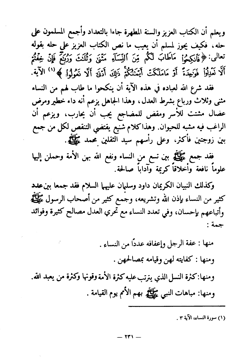 ويعلم أن الكتاب العزيز والسنة المطهرة جاءا بالتعداد وأجمع المسلمون على حله، فكيف يجوز لمسلم أن يعيب ما نص الكتاب العزيز على حله بقوله تعالى: {فَانْكِحُوا مَا طَابَ لَكُمْ مِنَ النِّسَاءِ مَثْنَى وَثُلَاثَ وَرُبَاعَ فَإِنْ خِفْتُمْ أَلَّا تَعْدِلُوا فَوَاحِدَةً أَوْ مَا مَلَكَتْ أَيْمَانُكُمْ ذَلِكَ أَدْنَى أَلَّا تَعُولُوا} (¬1) الآية.