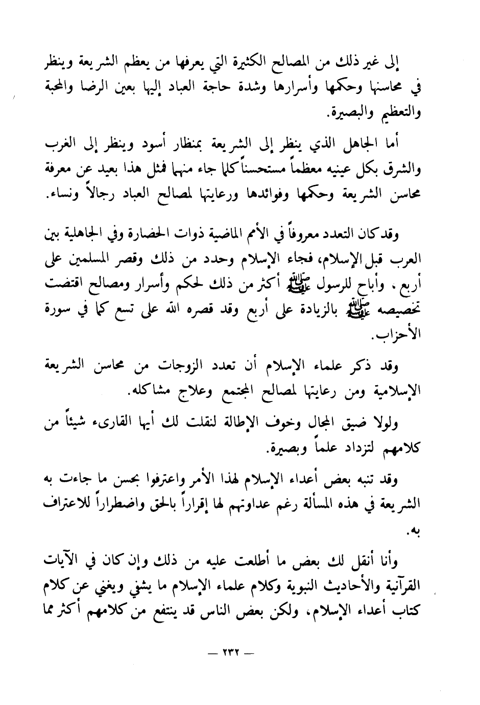 وقد ذكر علماء الإسلام أن تعدد الزوجات من محاسن الشريعة الإسلامية ومن رعايتها لمصالح المجتمع وعلاج مشاكله.