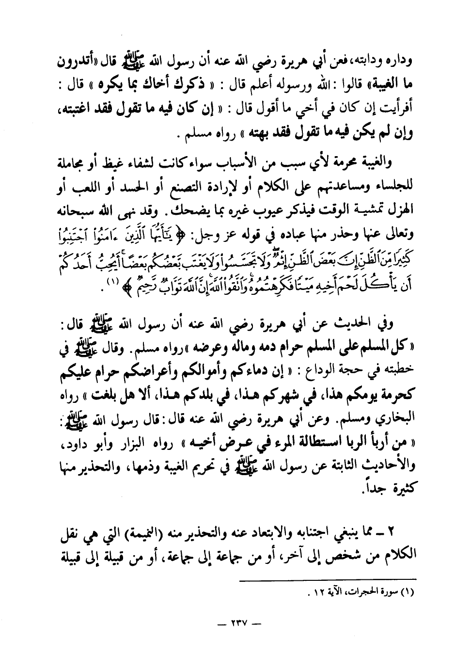 وداره ودابته. فعن أبي هريرة رضي الله عنه أن رسول الله صلى الله عليه وسلم قال: «أتدرون ما الغيبة؟ قالوا: الله ورسوله أعلم، قال: ذكرك أخاك بما يكره، قال: أفرأيت إن كان في أخي ما أقول؟ قال: إن كان فيه ما تقول فقد اغتبته وإن لم يكن فيه ما تقول فقد بهته (¬1) » رواه مسلم.