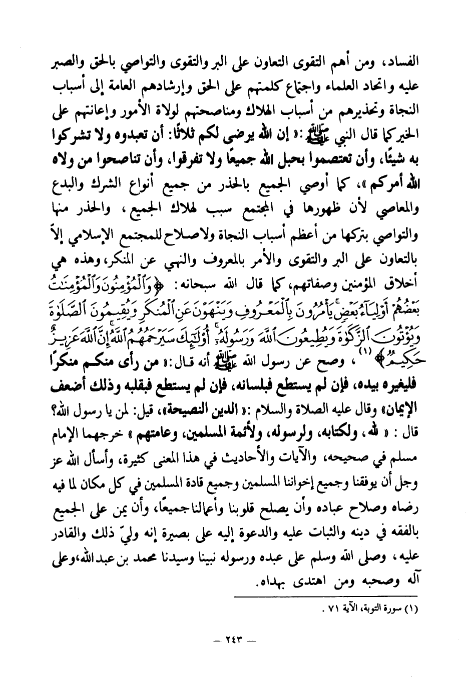 الفساد، ومن أهم التقوى التعاون على البر والتقوى والتواصي بالحق والصبر عليه واتحاد العلماء واجتماع كلمتهم على الحق، وإرشادهم العامة إلى أسباب النجاة وتحذيرهم من أسباب الهلاك ومناصحتهم لولاة الأمور وإعانتهم على الخير كما قال النبي صلى الله عليه وسلم: «إن الله يرضى لكم ثلاثا: أن تعبدوه ولا تشركوا به شيئا، وأن تعتصموا بحبل الله جميعا ولا تفرقوا، وأن تناصحوا من ولاه الله أمركم (¬1) » ، كما أوصي الجميع بالحذر من جميع أنواع الشرك والبدع والمعاصي لأن ظهورها في المجتمع سبب لهلاك الجميع، والحذر منها والتواصي بتركها من أعظم أسباب النجاة، ولا صلاح للمجتمع الإسلامي إلا بالتعاون على البر والتقوى والأمر بالمعروف والنهي عن المنكر وهذه هي أخلاق المؤمنين وصفاتهم كما قال الله سبحانه: {وَالْمُؤْمِنُونَ وَالْمُؤْمِنَاتُ بَعْضُهُمْ أَوْلِيَاءُ بَعْضٍ يَأْمُرُونَ بِالْمَعْرُوفِ وَيَنْهَوْنَ عَنِ الْمُنْكَرِ وَيُقِيمُونَ الصَّلَاةَ وَيُؤْتُونَ الزَّكَاةَ وَيُطِيعُونَ اللَّهَ وَرَسُولَهُ أُولَئِكَ سَيَرْحَمُهُمُ اللَّهُ إِنَّ اللَّهَ عَزِيزٌ حَكِيمٌ} (¬2) وصح عن رسول الله صلى الله عليه وسلم أنه قال: «من رأى منكم منكرا فليغيره بيده فإن لم يستطع فبلسانه فإن لم يستطع فبقلبه وذلك أضعف الإيمان (¬3) » ، وقال عليه الصلاة والسلام: «الدين النصيحة، قيل: لمن يا رسول الله؟ قال: لله ولكتابه ولرسوله ولأئمة المسلمين وعامتهم (¬4) » خرجهما الإمام مسلم في صحيحه، والآيات والأحاديث في هذا المعنى كثيرة، وأسأل الله عز وجل أن يوفقنا وجميع إخواننا وجميع المسلمين في كل مكان لما فيه رضاه وصلاح عباده، وأن يصلح قلوبنا وأعمالنا جميعا، وأن يمن على الجميع بالفقه في دينه والثبات عليه والدعوة إليه على بصيرة إنه ولي ذلك والقادر عليه، وصلى الله وسلم على عبده ورسوله نبينا وسيدنا محمد بن عبد الله وعلى آله وصحبه ومن اهتدى بهداه.