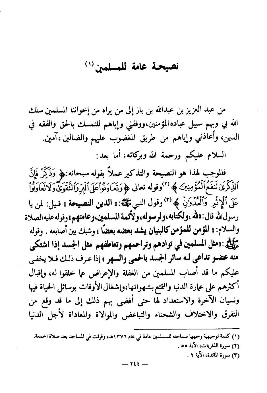 (¬1) كلمة توجيهية وجهها سماحته للمسلمين عامة في عام 1376 هـ وقرئت في المساجد بعد صلاة الجمعة.