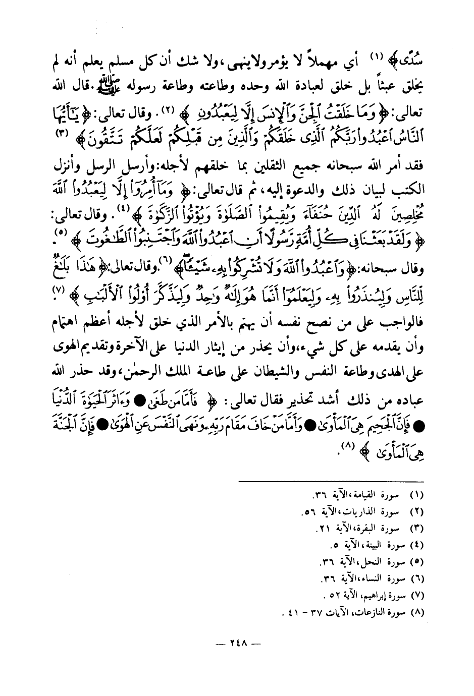 أي مهملا لا يؤمر ولا ينهى، ولا شك أن كل مسلم يعلم أنه لم يخلق عبثا بل خلق لعبادة الله وحده وطاعته وطاعة رسوله صلى الله عليه وسلم، قال الله تعالى: {وَمَا خَلَقْتُ الْجِنَّ وَالْإِنْسَ إِلَّا لِيَعْبُدُونِ} (¬1) وقال تعالى: {يَا أَيُّهَا النَّاسُ اعْبُدُوا رَبَّكُمُ الَّذِي خَلَقَكُمْ وَالَّذِينَ مِنْ قَبْلِكُمْ لَعَلَّكُمْ تَتَّقُونَ} (¬2) وقد أمر الله سبحانه جميع الثقلين بما خلقهم لأجله وأرسل الرسل وأنزل الكتب لبيان ذلك والدعوة إليه، ثم قال تعالى: {وَمَا أُمِرُوا إِلَّا لِيَعْبُدُوا اللَّهَ مُخْلِصِينَ لَهُ الدِّينَ حُنَفَاءَ وَيُقِيمُوا الصَّلَاةَ وَيُؤْتُوا الزَّكَاةَ} (¬3) وقال تعالى: {وَلَقَدْ بَعَثْنَا فِي كُلِّ أُمَّةٍ رَسُولًا أَنِ اُعْبُدُوا اللَّهَ وَاجْتَنِبُوا الطَّاغُوتَ} (¬4) وقال سبحانه: {وَاعْبُدُوا اللَّهَ وَلَا تُشْرِكُوا بِهِ شَيْئًا} (¬5) وقال تعالى: {هَذَا بَلَاغٌ لِلنَّاسِ وَلِيُنْذَرُوا بِهِ وَلِيَعْلَمُوا أَنَّمَا هُوَ إِلَهٌ وَاحِدٌ وَلِيَذَّكَّرَ أُولُو الْأَلْبَابِ} (¬6) فالواجب على من نصح نفسه أن يهتم بالأمر الذي خلق لأجله أعظم اهتمام وأن يقدمه على كل شيء، وأن يحذر من إيثار الدنيا على الآخرة وتقديم الهوى على الهدى وطاعة النفس والشيطان على طاعة الملك الرحمن، وقد حذر الله عباده من ذلك أشد تحذير فقال تعالى: {فَأَمَّا مَنْ طَغَى} (¬7) {وَآثَرَ الْحَيَاةَ الدُّنْيَا} (¬8) {فَإِنَّ الْجَحِيمَ هِيَ الْمَأْوَى} (¬9) {وَأَمَّا مَنْ خَافَ مَقَامَ رَبِّهِ وَنَهَى النَّفْسَ عَنِ الْهَوَى} (¬10) {فَإِنَّ الْجَنَّةَ هِيَ الْمَأْوَى} (¬11)