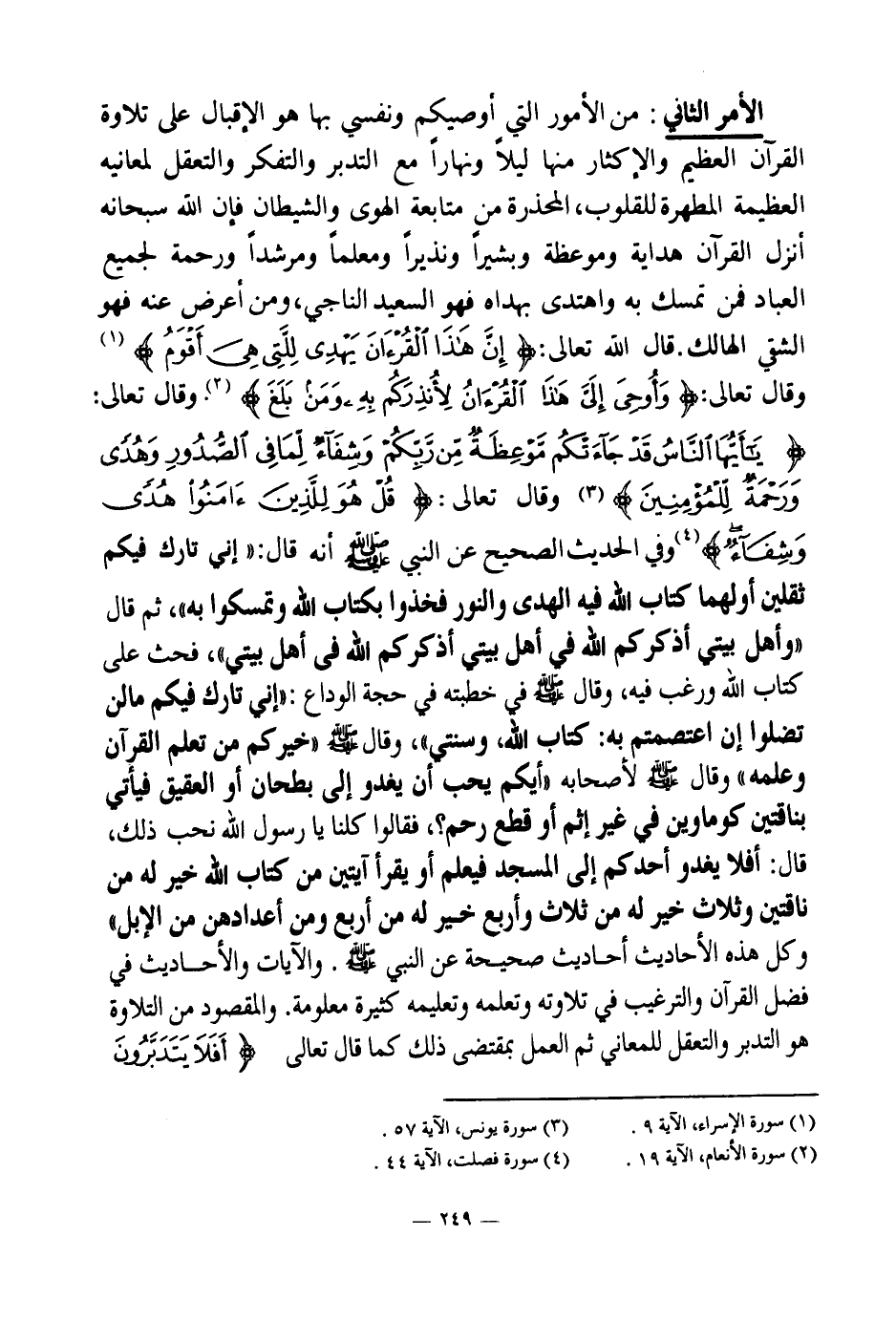 الأمر الثاني: في الأمور التي أوصيكم ونفسي بها هو الإقبال على تلاوة القرآن العظيم والإكثار منها ليلا ونهارا مع التدبر والتفكر والتعقل لمعانيه العظيمة المطهرة للقلوب المحذرة من متابعة الهوى والشيطان، فإن الله سبحانه أنزل القرآن هداية وموعظة وبشيرا ونذيرا ومعلما ومرشدا ورحمة لجميع العباد، فمن تمسك به واهتدى بهداه فهو السعيد الناجي ومن أعرض عنه فهو الشقي الهالك. قال الله تعالى: {إِنَّ هَذَا الْقُرْآنَ يَهْدِي لِلَّتِي هِيَ أَقْوَمُ} (¬1) وقال تعالى: {وَأُوحِيَ إِلَيَّ هَذَا الْقُرْآنُ لِأُنْذِرَكُمْ بِهِ وَمَنْ بَلَغَ} (¬2) وقال تعالى: {يَا أَيُّهَا النَّاسُ قَدْ جَاءَتْكُمْ مَوْعِظَةٌ مِنْ رَبِّكُمْ وَشِفَاءٌ لِمَا فِي الصُّدُورِ وَهُدًى وَرَحْمَةٌ لِلْمُؤْمِنِينَ} (¬3) وقال تعالى: {قُلْ هُوَ لِلَّذِينَ آمَنُوا هُدًى وَشِفَاءٌ} (¬4) وفي الحديث الصحيح عن النبي صلى الله عليه وسلم أنه قال: «إني تارك فيكم ثقلين أولهما كتاب الله فيه الهدى والنور فخذوا بكتاب الله وتمسكوا به (¬5) » فحث على كتاب الله ورغب فيه، وقال صلى الله عليه وسلم في خطبته في حجة الوداع: «إني تارك فيكم ما لن تضلوا إن اعتصمتم به كتاب الله (¬6) » ، وقال صلى الله عليه وسلم: «خيركم من تعلم القرآن وعلمه (¬7) » وقال صلى الله عليه وسلم لأصحابه: «أيكم يحب أن يغدو إلى بطحان أو العقيق فيأتي بناقتين كوماوين في غير إثم أو قطع رحم؟ فقالوا: كلنا يا رسول الله نحب ذلك، قال: أفلا يغدو أحدكم إلى المسجد فيعلم أو يقرأ آيتين في كتاب الله خير له من ناقتين، وثلاث خير له من ثلاث، وأربع خير له من أربع، ومن أعدادهن من الإبل (¬8) » . وكل هذه الأحاديث أحاديث صحيحة عن النبي صلى الله عليه وسلم.