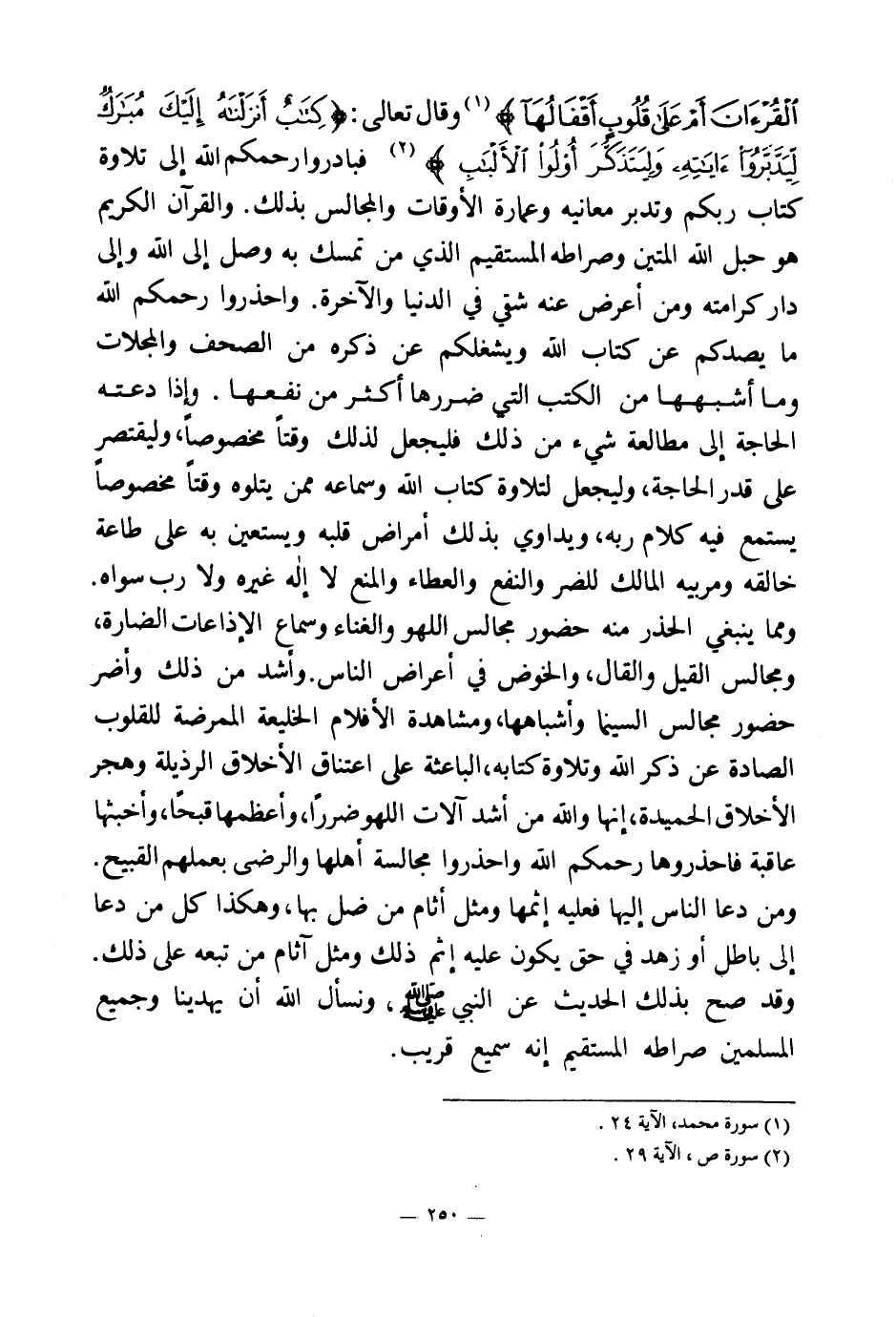 {أَفَلَا يَتَدَبَّرُونَ الْقُرْآنَ أَمْ عَلَى قُلُوبٍ أَقْفَالُهَا} (¬1) وقال تعالى: {كِتَابٌ أَنْزَلْنَاهُ إِلَيْكَ مُبَارَكٌ لِيَدَّبَّرُوا آيَاتِهِ وَلِيَتَذَكَّرَ أُولُو الْأَلْبَابِ} (¬2) فبادروا - رحمكم الله - إلى تلاوة كتاب ربكم وتدبر معانيه وعمارة الأوقات والمجالس بذلك. والقرآن الكريم هو حبل الله المتين وصراطه المستقيم الذي من تمسك به وصل إلى الله وإلى دار كرامته ومن أعرض عنه شقي في الدنيا والآخرة. واحذروا - رحمكم الله - ما يصدكم عن كتاب الله ويشغلكم عن ذكره من الصحف والمجلات وما أشبهها من الكتب التي ضررها أكثر من نفعها. وما دعته الحاجة إلى مطالعة شيء من ذلك فليجعل لذلك وقتا مخصوصا، وليقتصر على قدر الحاجة وليجعل لتلاوة كتاب الله وسماعه ممن يتلوه وقتا مخصوصا يستمع فيه كلام ربه، ويداوي بذلك أمراض قلبه ويستعين به على طاعة خالقه ومربيه المالك للضر والنفع والعطاء والمنع لا إله غيره ولا رب سواه.