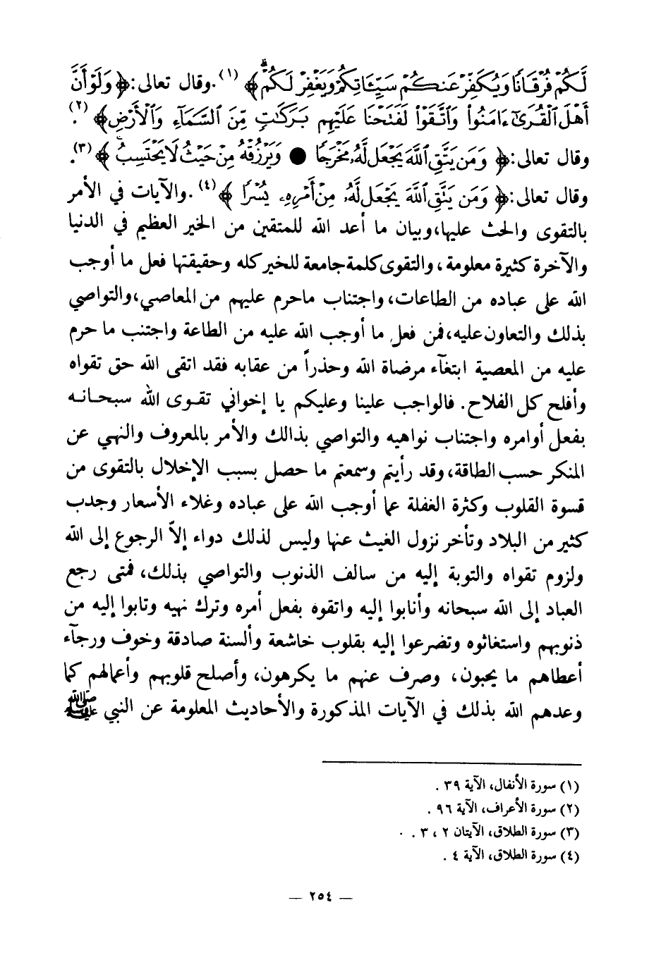 {إِنْ تَتَّقُوا اللَّهَ يَجْعَلْ لَكُمْ فُرْقَانًا وَيُكَفِّرْ عَنْكُمْ سَيِّئَاتِكُمْ وَيَغْفِرْ لَكُمْ} (¬1) وقال تعالى: {وَلَوْ أَنَّ أَهْلَ الْقُرَى آمَنُوا وَاتَّقَوْا لَفَتَحْنَا عَلَيْهِمْ بَرَكَاتٍ مِنَ السَّمَاءِ وَالْأَرْضِ} (¬2) وقال تعالى: {وَمَنْ يَتَّقِ اللَّهَ يَجْعَلْ لَهُ مَخْرَجًا} (¬3) {وَيَرْزُقْهُ مِنْ حَيْثُ لَا يَحْتَسِبُ} (¬4) وقال تعالى: {وَمَنْ يَتَّقِ اللَّهَ يَجْعَلْ لَهُ مِنْ أَمْرِهِ يُسْرًا} (¬5) والآيات في الأمر بالتقوى والحث عليها وبيان ما أعد الله للمتقين من الخير العظيم في الدنيا والآخرة كثيرة معلومة، والتقوى كلمة جامعة للخير كله وحقيقتها فعل ما أوجب الله على عباده من الطاعات واجتناب ما حرم عليهم من المعاصي، والتواصي بذلك والتعاون عليه، فمن فعل ما أوجب الله عليه من الطاعة واجتنب ما حرم عليه من المعصية ابتغاء مرضاة الله وحذرا من عقابه فقد اتقى الله حق تقواه وأفلح كل الفلاح. فالواجب علينا وعليكم يا إخواني تقوى الله سبحانه بفعل أوامره واجتناب نواهيه والتواصي بذلك والأمر بالمعروف والنهي عن المنكر حسب الطاقة. وقد رأيتم وسمعتم ما حصل بسبب الإخلال بالتقوى من قسوة القلوب وكثرة الغفلة عما أوجب الله على عباده وغلاء الأسعار وجدب كثير من البلاد وتأخر نزول الغيث عنها، وليس لذلك دواء إلا الرجوع إلى الله ولزوم تقواه والتوبة إليه من سالف الذنوب والتواصي بذلك، فمتى رجع العباد إلى الله سبحانه وأنابوا إليه واتقوه بفعل أمره وترك نهيه وتابوا إليه من ذنوبهم واستغاثوه وتضرعوا إليه بقلوب خاشعة وألسنة صادقة وخوف ورجاء أعطاهم ما يحبون، وصرف عنهم ما يكرهون وأصلح قلوبهم وأعمالهم كما وعدهم الله بذلك في الآيات المذكورة والأحاديث المعلومة عن النبي صلى الله عليه وسلم.