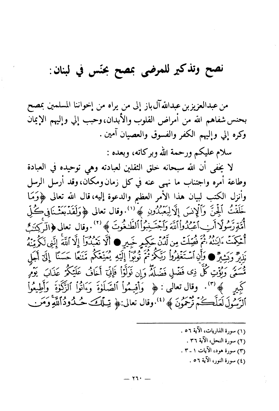 من عبد العزيز بن عبد الله بن باز إلى من يراه من إخواننا المسلمين بمصح بحنس شفاهم الله من أمراض القلوب والأبدان وحبب إلي وإليهم الإيمان وكره إلي وإليهم الكفر والفسوق والعصيان آمين، سلام عليكم ورحمة الله وبركاته، وبعد: