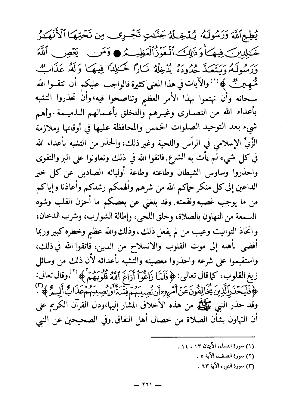وقد بلغني عن بعضكم ما أحزن القلب وشوه السمعة من التهاون بالصلاة وحلق اللحى وإطالة الشوارب وشرب الدخان واتخاذ التواليت وعيب من لم يفعل ذلك، وذلك والله عظيم وخطره كبير وربما أفضى بأهله إلى موت القلوب والانسلاخ من الدين، فاتقوا الله في ذلك واستقيموا على شرعه واحذروا معصيته والتشبه بأعدائه لأن ذلك من وسائل زيغ القلوب كما قال تعالى: {فَلَمَّا زَاغُوا أَزَاغَ اللَّهُ قُلُوبَهُمْ} (¬3) وقال تعالى: {فَلْيَحْذَرِ الَّذِينَ يُخَالِفُونَ عَنْ أَمْرِهِ أَنْ تُصِيبَهُمْ فِتْنَةٌ أَوْ يُصِيبَهُمْ عَذَابٌ أَلِيمٌ} (¬4) وقد حذر النبي صلى الله عليه وسلم من هذه الأخلاق المشار إليها ودل القرآن الكريم على أن التهاون بشأن الصلاة من خصال أهل النفاق. وفي الصحيحين عن النبي