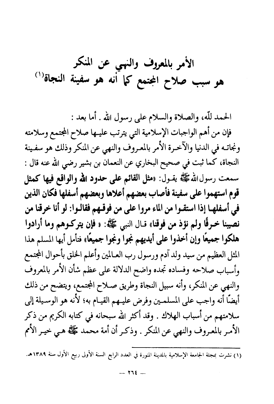 فإن من أهم الواجبات الإسلامية التي يترتب عليها صلاح المجتمع وسلامته ونجاته في الدنيا والآخرة الأمر بالمعروف والنهي عن المنكر، وذلك هو سفينة النجاة كما ثبت في صحيح البخاري عن النعمان بن بشير رضي الله عنه قال: سمعت رسول الله صلى الله عليه وسلم يقول: «مثل القائم على حدود الله والواقع فيها كمثل قوم استهموا على سفينة فأصاب بعضهم أعلاها وبعضهم أسفلها فكان الذين في أسفلها إذا استقوا من الماء مروا على من فوقهم فقالوا: لو أنا خرقنا من نصيبنا خرقا ولم نؤذ من فوقنا" قال النبي صلى الله عليه وسلم: " فإن يتركوهم وما أرادوا هلكوا جميعا، وإن أخذوا على أيديهم نجوا ونجوا جميعا (¬2) » ، فتأمل أيها المسلم هذا المثل العظيم من سيد ولد آدم ورسول رب العالمين وأعلم الخلق بأحوال المجتمع وأسباب صلاحه وفساده تجده واضح الدلالة على عظم شأن الأمر بالمعروف والنهي عن المنكر، وأنه سبيل النجاة وطريق صلاح المجتمع، ويتضح من ذلك أيضا أنه واجب على المسلمين وفرض عليهم القيام به؛ لأنه هو الوسيلة إلى سلامتهم من أسباب الهلاك.