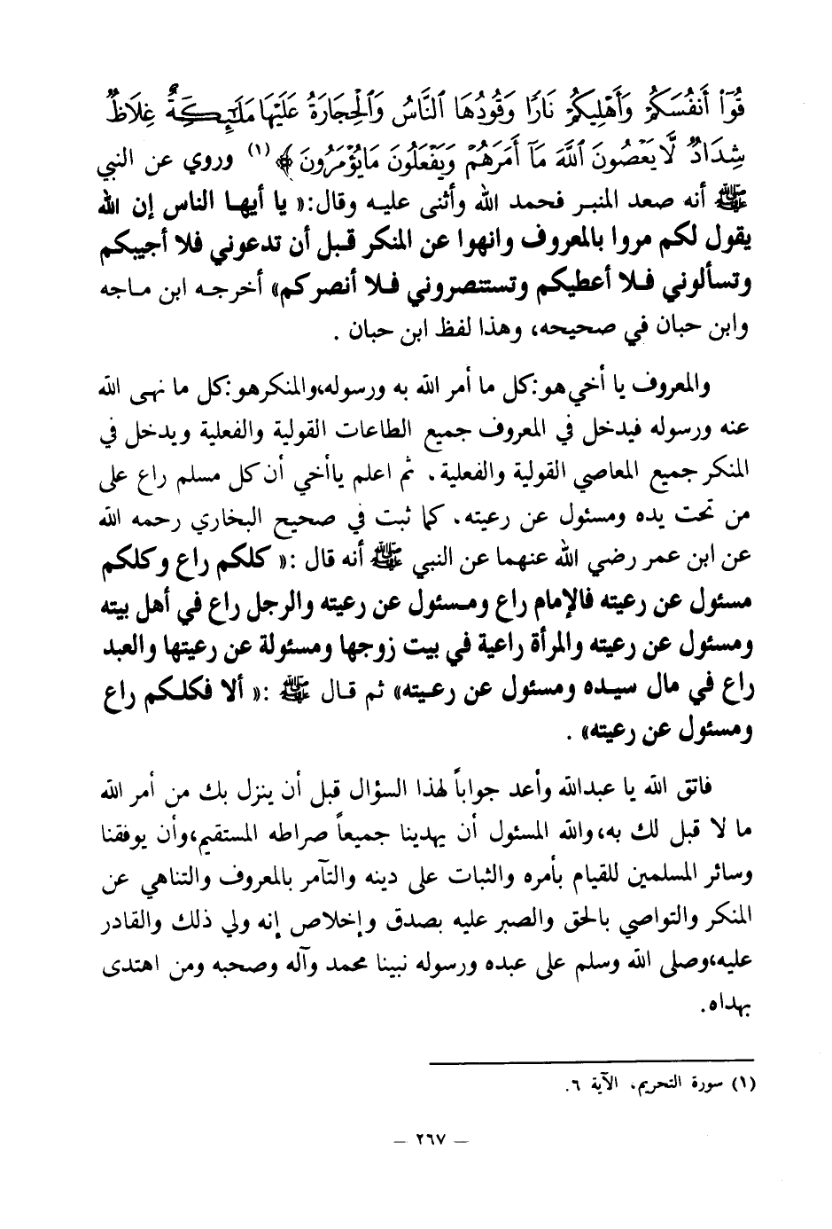 {يَا أَيُّهَا الَّذِينَ آمَنُوا قُوا أَنْفُسَكُمْ وَأَهْلِيكُمْ نَارًا وَقُودُهَا النَّاسُ وَالْحِجَارَةُ عَلَيْهَا مَلَائِكَةٌ غِلَاظٌ شِدَادٌ لَا يَعْصُونَ اللَّهَ مَا أَمَرَهُمْ وَيَفْعَلُونَ مَا يُؤْمَرُونَ} (¬1) وروي عن النبي صلى الله عليه وسلم أنه صعد المنبر فحمد الله وأثنى عليه وقال: «يا أيها الناس إن الله يقول لكم: مروا بالمعروف وانهوا عن المنكر قبل أن تدعوني فلا أجيبكم وتسألوني فلا أعطيكم وتستنصروني فلا أنصركم (¬2) » أخرجه ابن ماجه وابن حبان في صحيحه وهذا لفظ ابن حبان.