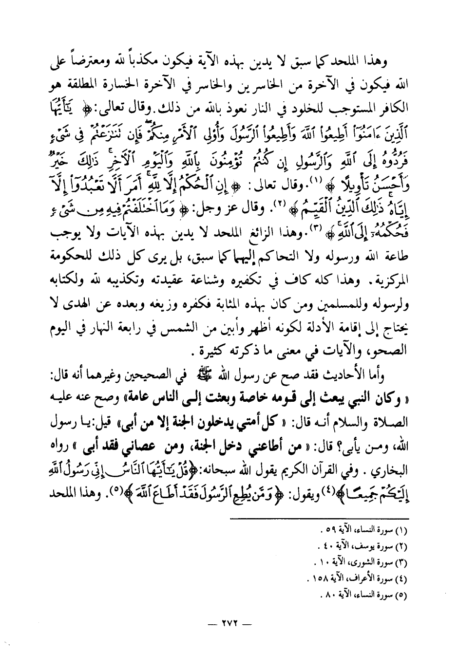 وهذا الملحد كما سبق لا يدين بهذه الآية فيكون مكذبا لله ومعترضا على الله فيكون في الآخرة من الخاسرين والخاسر في الآخرة الخسارة المطلقة هو الكافر المستوجب للخلود في النار نعوذ بالله من ذلك وقال تعالى: {يَا أَيُّهَا الَّذِينَ آمَنُوا أَطِيعُوا اللَّهَ وَأَطِيعُوا الرَّسُولَ وَأُولِي الْأَمْرِ مِنْكُمْ فَإِنْ تَنَازَعْتُمْ فِي شَيْءٍ فَرُدُّوهُ إِلَى اللَّهِ وَالرَّسُولِ إِنْ كُنْتُمْ تُؤْمِنُونَ بِاللَّهِ وَالْيَوْمِ الْآخِرِ ذَلِكَ خَيْرٌ وَأَحْسَنُ تَأْوِيلًا} (¬1) وقال تعالى: {إِنِ الْحُكْمُ إِلَّا لِلَّهِ أَمَرَ أَلَّا تَعْبُدُوا إِلَّا إِيَّاهُ ذَلِكَ الدِّينُ الْقَيِّمُ} (¬2) وقال عز وجل: {وَمَا اخْتَلَفْتُمْ فِيهِ مِنْ شَيْءٍ فَحُكْمُهُ إِلَى اللَّهِ} (¬3) وهذا الزائغ الملحد لا يدين بهذه الآيات ولا يوجب طاعة الله ورسوله ولا التحاكم إليهما كما سبق، بل يرى كل ذلك للحكومة المركزية، وهذا كله كاف في تكفيره وشناعة عقيدته وتكذيبه لله ولكتابه ولرسوله وللمسلمين ومن كان بهذه المثابة فكفره وزيغه وبعده عن الهدى لا يحتاج إلى إقامة الأدلة لكونه أظهر وأبين من الشمس في رابعة النهار في اليوم الصحو، والآيات في معنى ما ذكرته كثيرة.