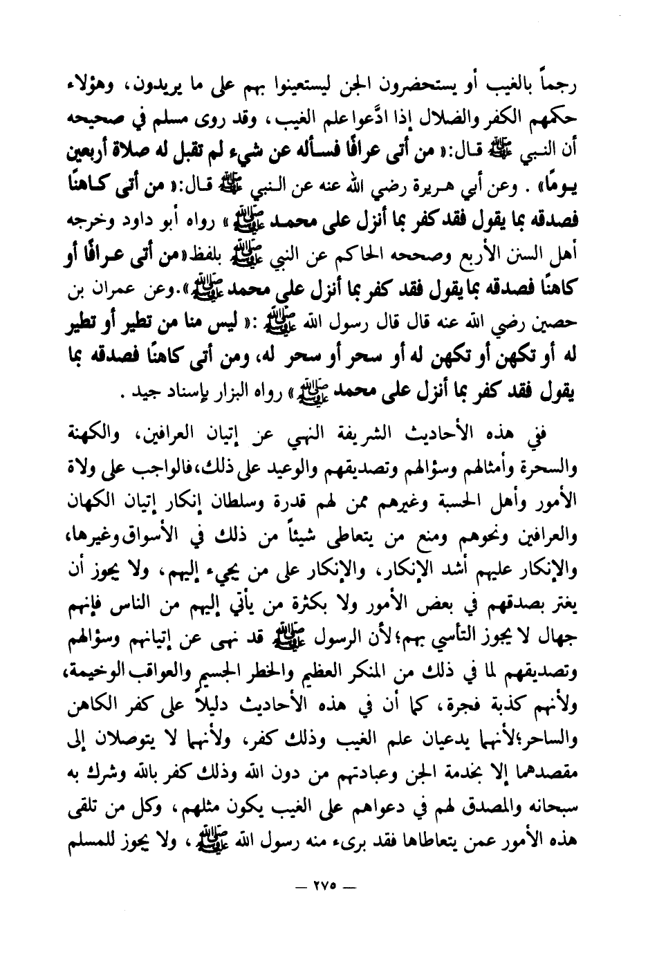 وقد روى مسلم في صحيحه أن النبي صلى الله عليه وسلم قال: «من أتى عرافا فسأله عن شيء لم تقبل له صلاة أربعين يوما (¬1) » وعن أبي هريرة رضي الله عنه عن النبي صلى الله عليه وسلم قال: «من أتى كاهنا فصدقه بما يقول: فقد كفر بما أنزل على محمد صلى الله عليه وسلم (¬2) » رواه أبو داود وخرجه أهل السنن الأربع وصححه الحاكم عن النبي صلى الله عليه وسلم بلفظ «من أتى عرافا أو كاهنا فصدقه بما يقول فقد كفر بما أنزل على محمد صلى الله عليه وسلم (¬3) » ، وعن عمران بن حصين رضي الله عنه قال: قال رسول الله صلى الله عليه وسلم «ليس منا من تطير أو تطير له أو تكهن أو تكهن له أو سحر أو سحر له، ومن أتى كاهنا فصدقه بما يقول: فقد كفر بما أنزل على محمد صلى الله عليه وسلم (¬4) » رواه البزار بإسناد جيد.