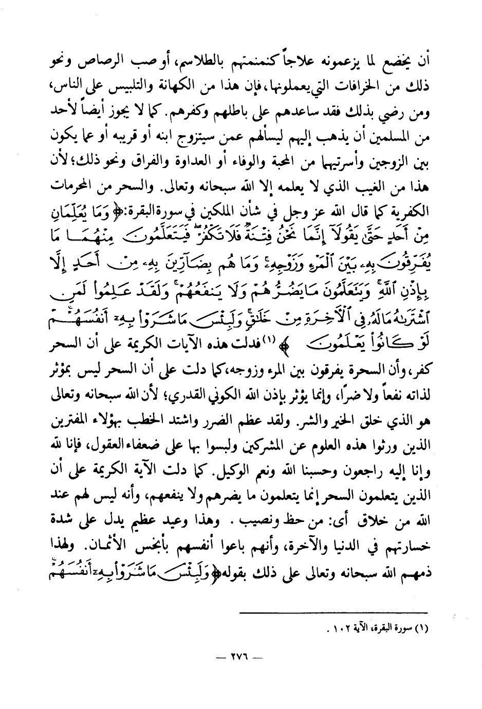 فدلت هذه الآيات الكريمة على أن السحر كفر، وأن السحرة يفرقون بين المرء وزوجه، كما دلت على أن السحر ليس بمؤثر لذاته نفعا ولا ضرا وإنما يؤثر بإذن الله الكوني القدري؛ لأن الله سبحانه وتعالى هو الذي خلق الخير والشر، ولقد عظم الضرر واشتد الخطب بهؤلاء المفترين الذين ورثوا هذه العلوم عن المشركين ولبسوا بها على ضعفاء العقول فإنا لله وإنا إليه راجعون وحسبنا الله ونعم الوكيل.