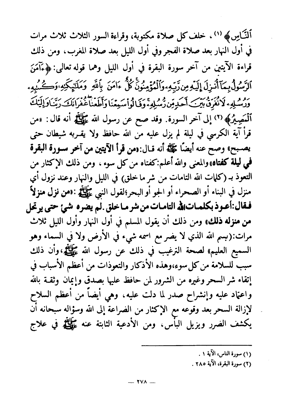 خلف كل صلاة مكتوبة، وقراءة السور الثلاث ثلاث مرات في أول النهار بعد صلاة الفجر وفي أول الليل بعد صلاة المغرب، ومن ذلك قراءة الآيتين من آخر سورة البقرة في أول الليل وهما قوله تعالى: {آمَنَ الرَّسُولُ بِمَا أُنْزِلَ إِلَيْهِ مِنْ رَبِّهِ وَالْمُؤْمِنُونَ كُلٌّ آمَنَ بِاللَّهِ وَمَلَائِكَتِهِ وَكُتُبِهِ وَرُسُلِهِ لَا نُفَرِّقُ بَيْنَ أَحَدٍ مِنْ رُسُلِهِ وَقَالُوا سَمِعْنَا وَأَطَعْنَا غُفْرَانَكَ رَبَّنَا وَإِلَيْكَ الْمَصِيرُ} (¬1) إلى آخر السورة، وقد صح عن رسول الله صلى الله عليه وسلم أنه قال: «من قرأ آية الكرسي في ليلة لم يزل عليه من الله حافظ ولا يقربه شيطان حتى يصبح (¬2) » ، وصح عنه أيضا صلى الله عليه وسلم أنه قال: «من قرأ الآيتين من آخر سورة البقرة في ليلة كفتاه (¬3) » ، والمعنى والله أعلم: كفتاه من كل سوء، ومن ذلك الإكثار من التعوذ بـ (كلمات الله التامات من شر ما خلق) في الليل والنهار وعند نزول أي منزل في البناء أو الصحراء أو الجو أو البحر؛ لقول النبي صلى الله عليه وسلم: «من نزل منزلا فقال أعوذ بكلمات الله التامات من شر ما خلق لم يضره شيء حتى يرتحل من منزله ذلك (¬4) » ، ومن ذلك أن يقول المسلم في أول النهار وأول الليل ثلاث مرات: (بسم الله الذي لا يضر مع اسمه شيء في الأرض ولا في السماء وهو السميع العليم) لصحة الترغيب في ذلك عن رسول الله صلى الله عليه وسلم، وأن ذلك سبب للسلامة من كل سوء، وهذه الأذكار والتعوذات من أعظم الأسباب في اتقاء شر السحر وغيره من الشرور لمن حافظ عليها بصدق وإيمان وثقة بالله واعتماد عليه وانشراح صدر لما دلت عليه، وهي أيضا من أعظم السلاح لإزالة السحر بعد وقوعه مع الإكثار من الضراعة إلى الله وسؤاله سبحانه أن يكشف الضرر ويزيل البأس، ومن الأدعية الثابتة عنه صلى الله عليه وسلم في علاج