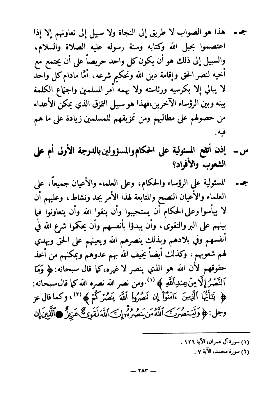 ج- المسئولية على الرؤساء والحكام وعلى العلماء والأعيان جميعا، على العلماء والأعيان النصح والمتابعة لهذا الأمر بجد ونشاط وعليهم أن لا ييأسوا وعلى الحكام أن يستجيبوا وأن يتقوا الله وأن يتعاونوا فيما بينهم على البر والتقوى، وأن يبدءوا بأنفسهم وأن يحكموا شرع الله في أنفسهم وفي بلادهم وبذلك ينصرهم الله ويعينهم على الحق ويهدي لهم شعوبهم وكذلك أيضا يخيف الله بهم عدوهم ويمكنهم من أخذ حقوقهم لأن الله هو الذي ينصر لا غيره، كما قال سبحانه: {وَمَا النَّصْرُ إِلَّا مِنْ عِنْدِ اللَّهِ} (¬1) ومن نصر الله نصره الله كما قال سبحانه: {يَا أَيُّهَا الَّذِينَ آمَنُوا إِنْ تَنْصُرُوا اللَّهَ يَنْصُرْكُمْ} (¬2) وكما قال عز وجل: {وَلَيَنْصُرَنَّ اللَّهُ مَنْ يَنْصُرُهُ إِنَّ اللَّهَ لَقَوِيٌّ عَزِيزٌ} (¬3) {الَّذِينَ إِنْ مَكَّنَّاهُمْ فِي الْأَرْضِ أَقَامُوا الصَّلَاةَ وَآتَوُا الزَّكَاةَ وَأَمَرُوا بِالْمَعْرُوفِ وَنَهَوْا عَنِ الْمُنْكَرِ} (¬4)