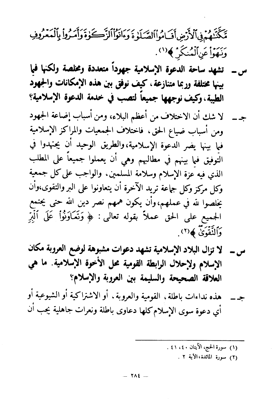 س- لا تزال البلاد الإسلامية تشهد دعوات مشبوهة لوضع العروبة مكان الإسلام ولإحلال الرابطة القومية محل الأخوة الإسلامية.