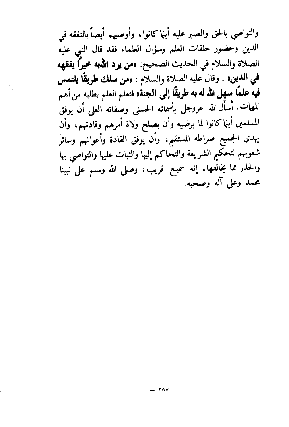 والتواصي بالحق والصبر عليه أينما كانوا، وأوصيهم أيضا بالتفقه في الدين وحضور حلقات العلم وسؤال العلماء فقد قال النبي عليه الصلاة والسلام في الحديث الصحيح: «من يرد الله به خيرا يفقهه في الدين (¬1) » . وقال عليه الصلاة والسلام: «من سلك طريقا يلتمس فيه علما سهل الله له به طريقا إلى الجنة (¬2) » فتعلم العلم بطلبه من أهم المهمات.