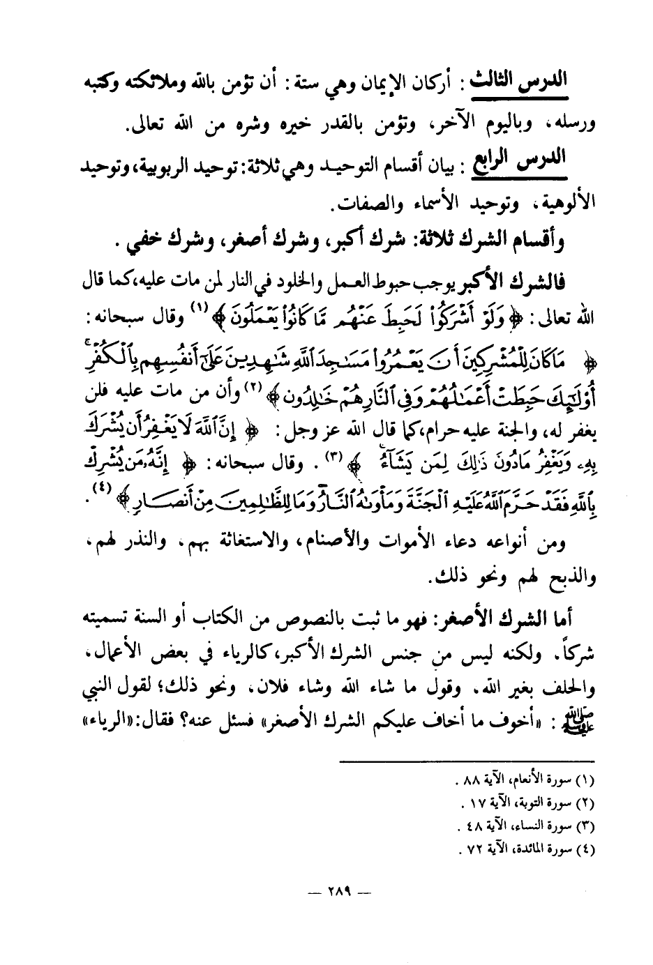 الدرس الرابع: بيان أقسام التوحيد، وهي ثلاثة: توحيد الربوبية، وتوحيد الألوهية، وتوحيد الأسماء والصفات.