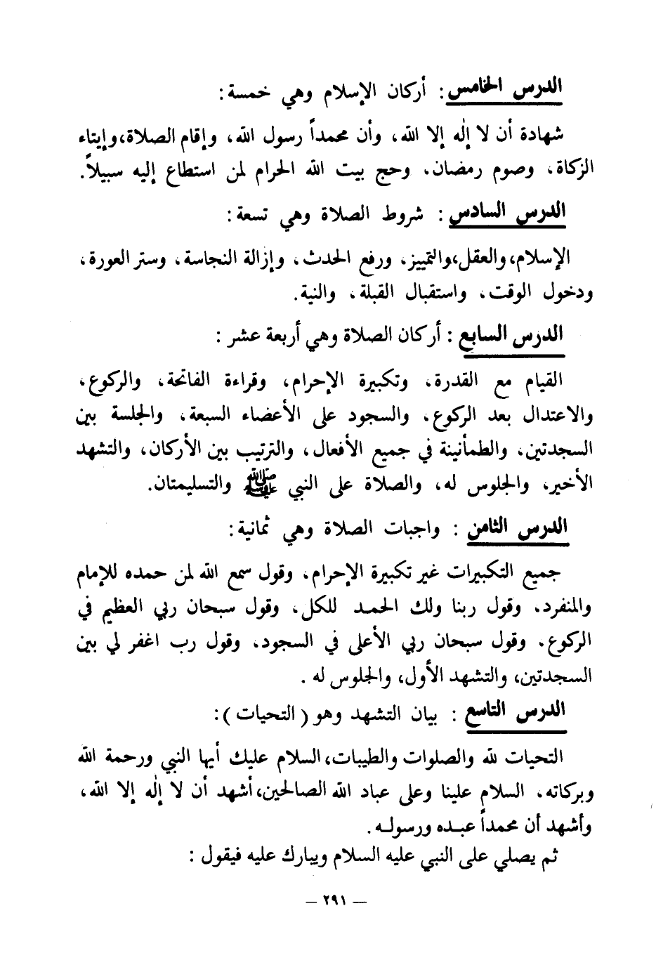 الدرس الخامس: أركان الإسلام وهي خمسة: شهادة أن لا إله إلا الله، وأن محمدا رسول الله، وإقام الصلاة، وإيتاء الزكاة، وصوم رمضان، وحج بيت الله الحرام لمن استطاع إليه سبيلا.