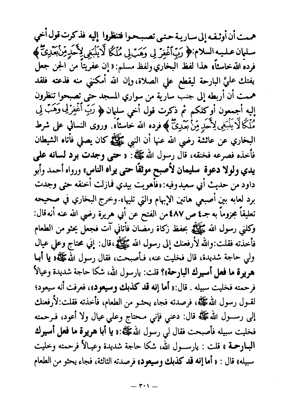 هممت أن أوثقه إلى سارية حتى تصبحوا فتنظروا إليه فذكرت قول أخي سليمان عليه السلام فرده الله خاسئا (¬2) » هذا لفظ البخاري ولفظ مسلم: «إن عفريتا من الجن جعل يفتك علي البارحة ليقطع علي الصلاة وإن الله أمكنني منه فذعته فلقد هممت أن أربطه إلى جنب سارية من سواري المسجد حتى تصبحوا تنظرون إليه أجمعون أو كلكم ثم ذكرت قول أخي سليمان فرده الله خاسئا (¬4) » .