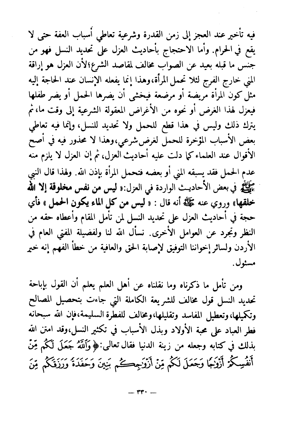 فيه تأخير عند العجز إلى زمن القدرة وشرعية تعاطي أسباب العفة حتى لا يقع في الحرام وأما الاحتجاج بأحاديث العزل على تحديد النسل فهو من جنس ما قبله بعيد عن الصواب مخالف لمقاصد الشرع؛ لأن العزل هو إراقة المني خارج الفرج لئلا تحمل المرأة وهذا إنما يفعله الإنسان عند الحاجة إليه مثل كون المرأة مريضة أو مرضعة فيخشى أن يضرها الحمل أو يضر طفلها فيعزل لهذا الغرض، أو نحوه من الأغراض المعقولة الشرعية إلى وقت ما، ثم يترك ذلك وليس في هذا قطع للحمل ولا تحديد للنسل وإنما فيه تعاطي بعض الأسباب المؤخرة للحمل لغرض شرعي، وهذا لا محذور فيه في أصح الأقوال عند العلماء كما دلت عليه أحاديث العزل ثم إن العزل لا يلزم منه عدم الحمل فقد يسبقه المني أو بعضه فتحمل المرأة بإذن الله، ولهذا قال النبي صلى الله عليه وسلم في بعض الأحاديث الواردة في العزل: «ليس من نفس مخلوقة إلا الله خلقها (¬1) » ، وروي عنه صلى الله عليه وسلم أنه قال: «ليس من كل الماء يكون الحمل (¬2) » فأي حجة في أحاديث العزل على تحديد النسل لمن تأمل المقام وأعطاه حقه من النظر وتجرد عن العوامل الأخرى نسأل الله لنا ولفضيلة المفتي العام في الأردن ولسائر إخواننا التوفيق لإصابة الحق والعافية من خطأ الفهم إنه خير مسئول.
