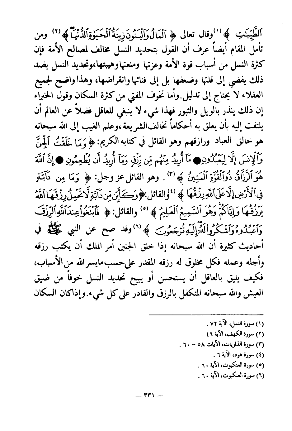 وقال تعالى {الْمَالُ وَالْبَنُونَ زِينَةُ الْحَيَاةِ الدُّنْيَا} (¬1) ومن تأمل المقام أيضا عرف أن القول بتحديد النسل مخالف لمصالح الأمة فإن كثرة النسل من أسباب قوة الأمة وعزتها ومنعتها وهيبتها وتحديد النسل بضد ذلك يفضي إلي قلتها وضعفها بل إلى فنائها وانقراضها، وهذا واضح لجميع العقلاء لا يحتاج إلى تدليل وأما تخوف المفتي من كثرة السكان وقول الخبراء إن ذلك ينذر بالويل والثبور فهذا شيء لا ينبغي للعاقل، فضلا عن العالم أن يلتفت إليه بأن يعلق به أحكاما تخالف الشريعة وعلم الغيب إلى الله سبحانه هو خالق العباد ورازقهم وهو القائل في كتابه الكريم: {وَمَا خَلَقْتُ الْجِنَّ وَالْإِنْسَ إِلَّا لِيَعْبُدُونِ} (¬2) {مَا أُرِيدُ مِنْهُمْ مِنْ رِزْقٍ وَمَا أُرِيدُ أَنْ يُطْعِمُونِ} (¬3) {إِنَّ اللَّهَ هُوَ الرَّزَّاقُ ذُو الْقُوَّةِ الْمَتِينُ} (¬4) وهو القائل عز وجل: {وَمَا مِنْ دَابَّةٍ فِي الْأَرْضِ إِلَّا عَلَى اللَّهِ رِزْقُهَا} (¬5) والقائل: {وَكَأَيِّنْ مِنْ دَابَّةٍ لَا تَحْمِلُ رِزْقَهَا اللَّهُ يَرْزُقُهَا وَإِيَّاكُمْ وَهُوَ السَّمِيعُ الْعَلِيمُ} (¬6) والقائل: {فَابْتَغُوا عِنْدَ اللَّهِ الرِّزْقَ وَاعْبُدُوهُ وَاشْكُرُوا لَهُ إِلَيْهِ تُرْجَعُونَ} (¬7) وقد صح عن النبي صلى الله عليه وسلم في أحاديث كثيرة «أن الله سبحانه إذا خلق الجنين أمر الملك أن يكتب رزقه وأجله وعمله (¬8) » ، فكل مخلوق له رزقه المقدر على حسب ما يسر الله من الأسباب، فكيف يليق بالعاقل أن يستحسن أو يبيح تحديد النسل خوفا من ضيق العيش والله سبحانه المتكفل بالرزق والقادر على كل شيء؟ وإذا كان السكان