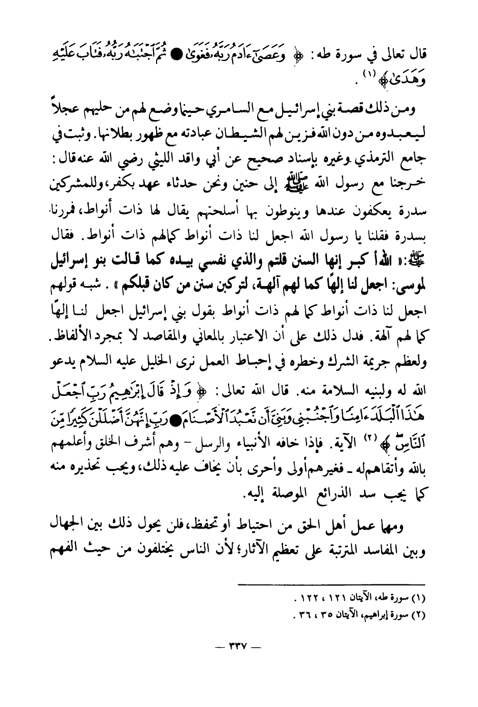 ومن ذلك قصة بني إسرائيل مع السامري حينما وضع لهم من حليهم عجلا ليعبدوه من دون الله فزين لهم الشيطان عبادته مع ظهور بطلانها، وثبت في جامع الترمذي وغيره بإسناد صحيح عن أبي واقد الليثي رضي الله عنه قال «خرجنا مع رسول الله صلى الله عليه وسلم إلى حنين ونحن حدثاء عهد بكفر وللمشركين سدرة يعكفون عندها وينوطون بها أسلحتهم يقال لها ذات أنواط فمررنا بسدرة فقلنا يا رسول الله اجعل لنا ذات أنواط كما لهم ذات أنواط فقال صلى الله عليه وسلم: الله أكبر إنها السنن قلتم والذي نفسي بيده كما قالت بنو إسرائيل لموسى: اجعل لنا إلها كما لهم آلهة؛ لتركبن سنن من كان قبلكم (¬3) » شبه قولهم اجعل لنا ذات أنواط كما لهم ذات أنواط بقول بني إسرائيل اجعل لنا إلها كما لهم آلهة فدل ذلك على أن الاعتبار بالمعاني والمقاصد لا بمجرد الألفاظ، ولعظم جريمة الشرك وخطره في إحباط العمل نرى الخليل عليه السلام يدعو الله له ولبنيه السلامة منه قال الله تعالى: {وَإِذْ قَالَ إِبْرَاهِيمُ رَبِّ اجْعَلْ هَذَا الْبَلَدَ آمِنًا وَاجْنُبْنِي وَبَنِيَّ أَنْ نَعْبُدَ الْأَصْنَامَ} (¬4) {رَبِّ إِنَّهُنَّ أَضْلَلْنَ كَثِيرًا مِنَ النَّاسِ} (¬5) الآية فإذا خافه الأنبياء والرسل - وهم أشرف الخلق وأعلمهم بالله وأتقاهم له - فغيرهم أولى وأحرى بأن يخاف عليه ذلك ويجب تحذيره منه كما يجب سد الذرائع الموصلة إليه.