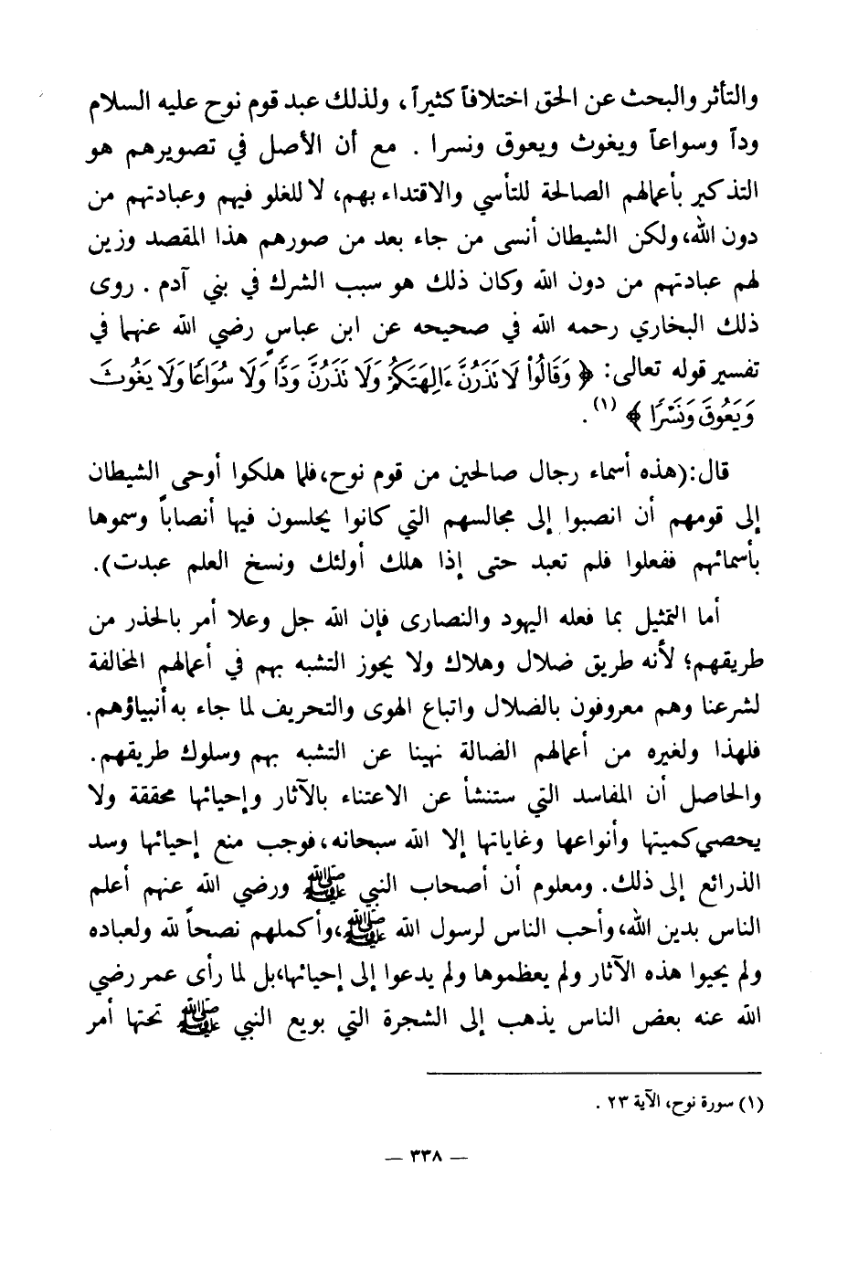 عن ابن عباس رضي الله عنهما في تفسير قوله تعالى {وَقَالُوا لَا تَذَرُنَّ آلِهَتَكُمْ وَلَا تَذَرُنَّ وَدًّا وَلَا سُوَاعًا وَلَا يَغُوثَ وَيَعُوقَ وَنَسْرًا} (¬1) قال هذه أسماء رجال صالحين من قوم نوح، فلما هلكوا أوحى الشيطان إلى قومهم أن انصبوا إلى مجالسهم التي كانوا يجلسون فيها أنصابا وسموها بأسمائهم؛ ففعلوا، فلم تعبد حتى إذا هلك أولئك ونسخ العلم عبدت.