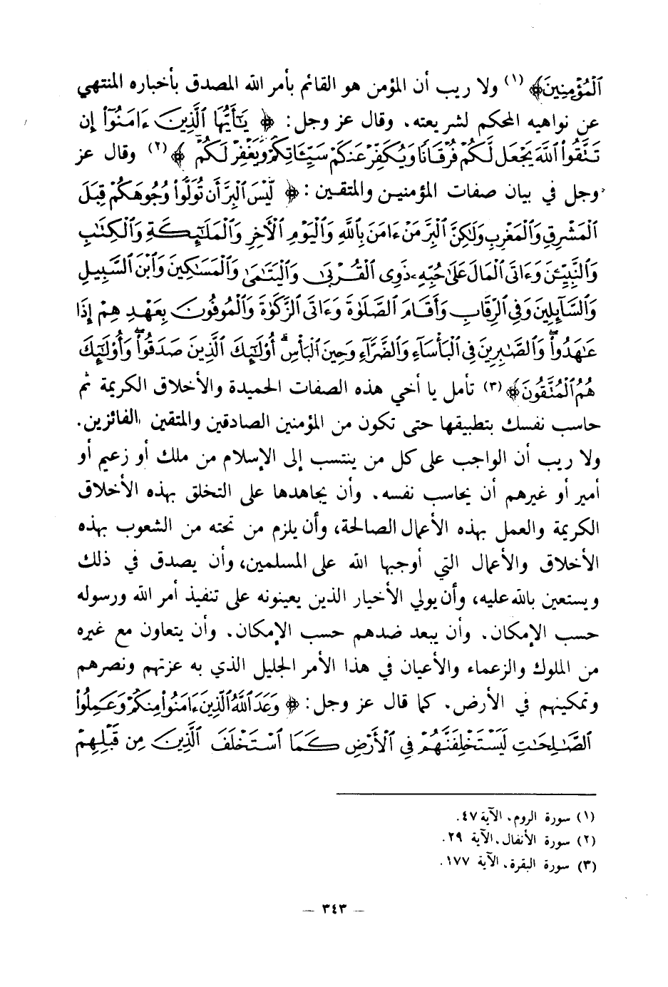 تأمل يا أخي هذه الصفات الحميدة والأخلاق الكريمة ثم حاسب نفسك بتطبيقها حتى تكون من المؤمنين الصادقين والمتقين الفائزين، ولا ريب أن الواجب على كل من ينتسب إلى الإسلام من ملك أو زعيم أو أمير أو غيرهم أن يحاسب نفسه وأن يجاهدها على التخلق بهذه الأخلاق الكريمة، والعمل بهذه الأعمال الصالحة، وأن يلزم من تحته من الشعوب بهذه الأخلاق والأعمال التي أوجبها الله على المسلمين، وأن يصدق في ذلك ويستعين بالله عليه وأن يولي الأخيار الذين يعينونه على تنفيذ أمر الله ورسوله حسب الإمكان وأن يبعد ضدهم حسب الإمكان وأن يتعاون مع غيره من الملوك والزعماء والأعيان في هذا الأمر الجليل الذي به عزتهم ونصرهم وتمكينهم في الأرض كما قال عز وجل: {وَعَدَ اللَّهُ الَّذِينَ آمَنُوا مِنْكُمْ وَعَمِلُوا الصَّالِحَاتِ لَيَسْتَخْلِفَنَّهُمْ فِي الْأَرْضِ كَمَا اسْتَخْلَفَ الَّذِينَ مِنْ قَبْلِهِمْ وَلَيُمَكِّنَنَّ لَهُمْ دِينَهُمُ الَّذِي ارْتَضَى لَهُمْ وَلَيُبَدِّلَنَّهُمْ مِنْ بَعْدِ خَوْفِهِمْ أَمْنًا يَعْبُدُونَنِي لَا يُشْرِكُونَ بِي شَيْئًا وَمَنْ كَفَرَ بَعْدَ ذَلِكَ فَأُولَئِكَ هُمُ الْفَاسِقُونَ} (¬3)