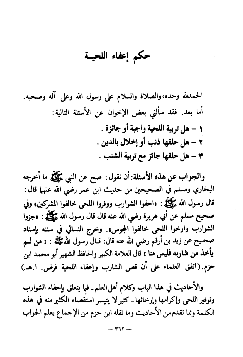 والجواب عن هذه الأسئلة: أن نقول: صح عن النبي صلى الله عليه وسلم ما أخرجه البخاري ومسلم في الصحيحين من حديث ابن عمر رضي الله عنهما قال: قال: رسول الله صلى الله عليه وسلم: «أحفوا الشوارب ووفروا اللحى خالفوا المشركين (¬1) » وفي صحيح مسلم عن أبي هريرة رضي الله عنه قال: قال رسول الله صلى الله عليه وسلم: «جزوا الشوارب وارخوا اللحى خالفوا المجوس (¬2) » .