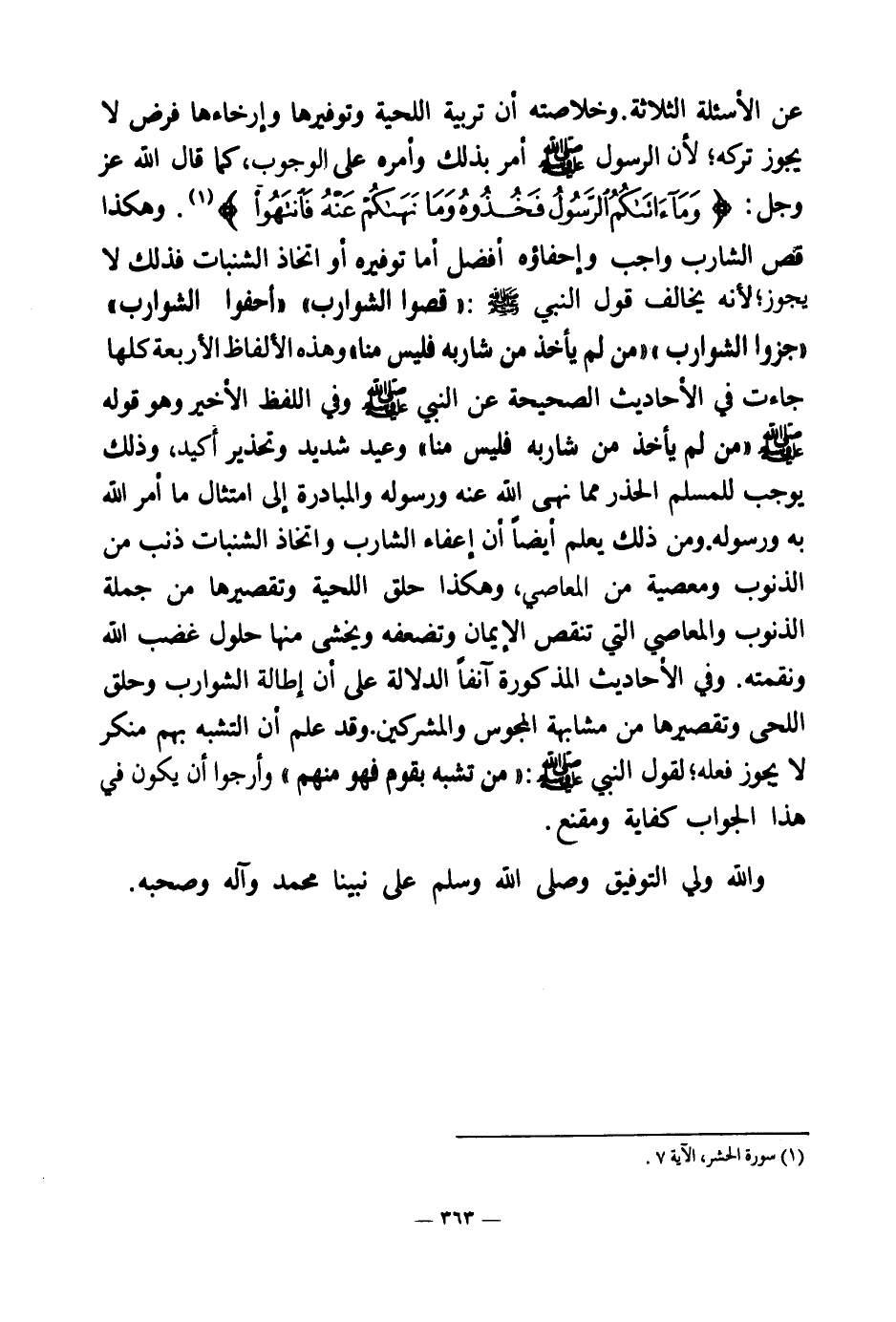 وفي الأحاديث المذكورة آنفا الدلالة على أن إطالة الشوارب وحلق اللحى وتقصيرها من مشابهة المجوس والمشركين، وقد علم أن التشبه بهم منكر لا يجوز فعله؛ لقول النبي صلى الله عليه وسلم: «من تشبه بقوم فهو منهم (¬7) » وأرجوا أن يكون في هذا الجواب كفاية ومقنع.