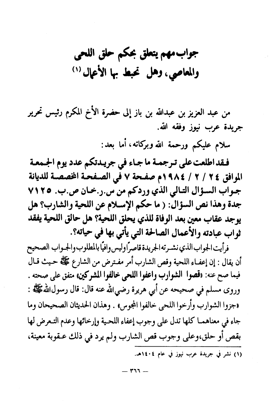من عبد العزيز بن عبد الله بن باز إلى حضرة الأخ المكرم رئيس تحرير جريدة عرب نيوز وفقه الله.