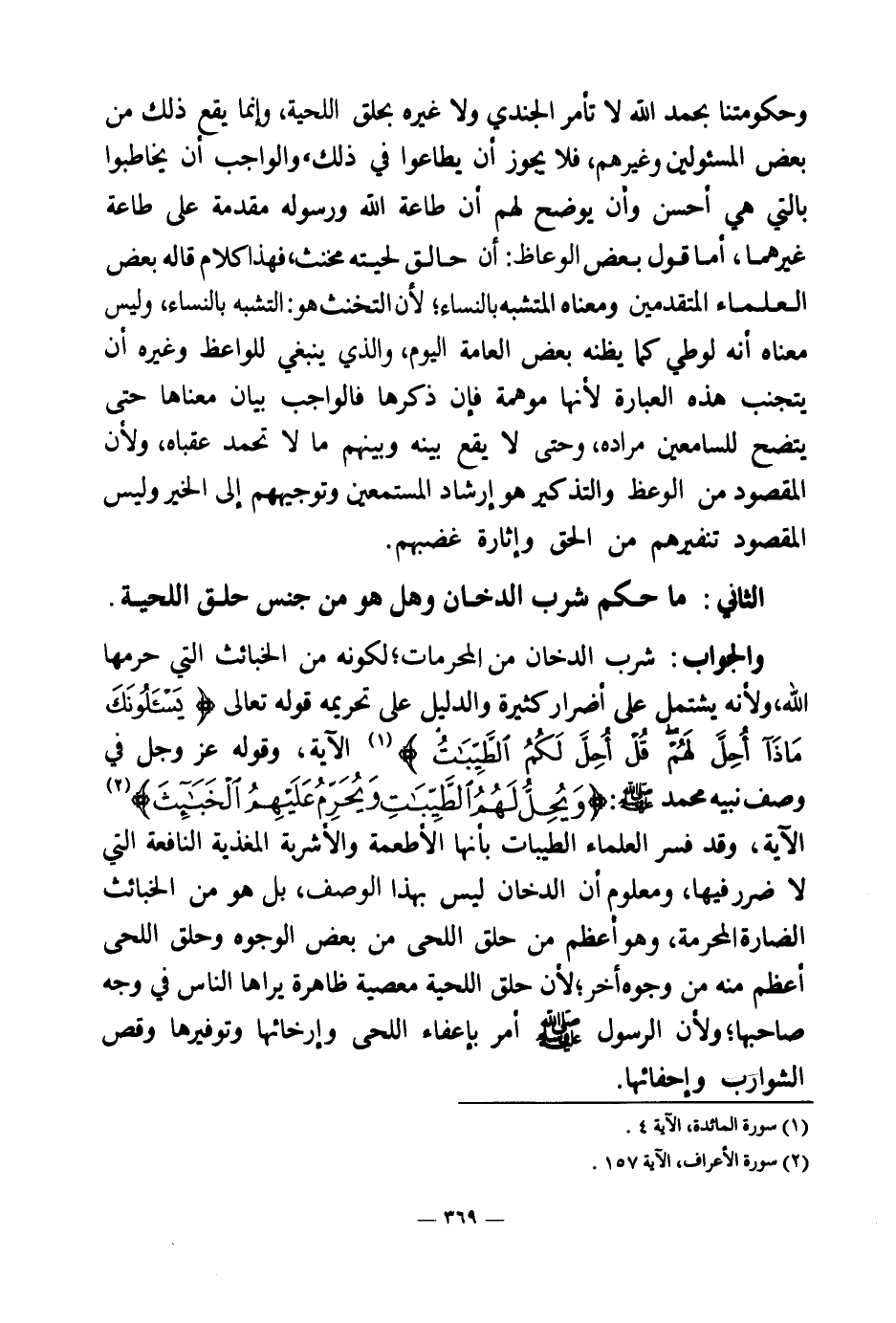 والجواب: شرب الدخان من المحرمات؛ لكونه من الخبائث التي حرمها الله، ولأنه يشتمل على أضرار كثيرة والدليل على تحريمه قوله تعالى: {يَسْأَلُونَكَ مَاذَا أُحِلَّ لَهُمْ قُلْ أُحِلَّ لَكُمُ الطَّيِّبَاتُ} (¬1) الآية، وقوله عز وجل في وصف نبيه محمد صلى الله عليه وسلم: {وَيُحِلُّ لَهُمُ الطَّيِّبَاتِ وَيُحَرِّمُ عَلَيْهِمُ الْخَبَائِثَ} (¬2) الآية، وقد فسر العلماء الطيبات بأنها الأطعمة والأشربة المغذية النافعة التي لا ضرر فيها، ومعلوم أن الدخان ليس بهذا الوصف، بل هو من الخبائث الضارة المحرمة، وهو أعظم من حلق اللحى من بعض الوجوه وحلق اللحى أعظم منه من وجوه أخر؛ لأن حلق اللحية معصية ظاهرة يراها الناس في وجه صاحبها؛ ولأن الرسول صلى الله عليه وسلم أمر بإعفاء اللحى وإرخائها وتوفيرها وقص الشوارب وإحفائها.