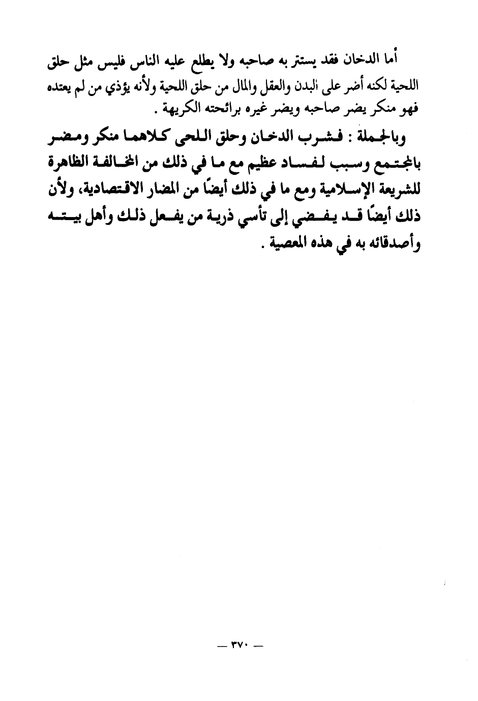 وبالجملة: فشرب الدخان وحلق اللحى كلاهما منكر ومضر بالمجتمع وسبب لفساد عظيم مع ما في ذلك من المخالفة الظاهرة للشريعة الإسلامية ومع ما في ذلك أيضا من المضار الاقتصادية، ولأن ذلك أيضا قد يفضي إلى تأسي ذرية من يفعل ذلك وأهل بيته وأصدقائه به في هذه المعصية.