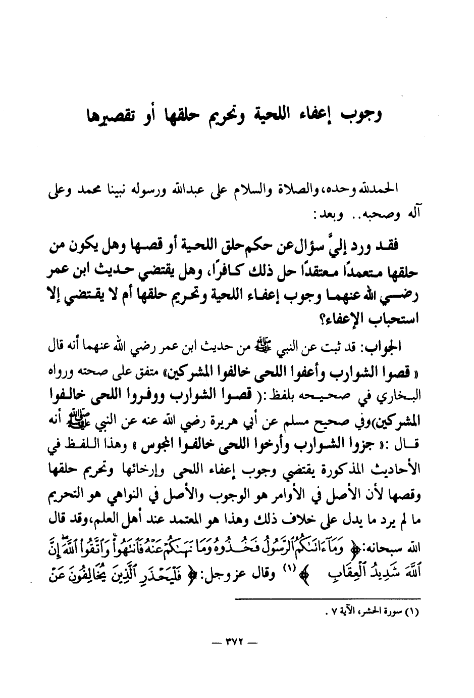 الجواب: قد ثبت عن النبي صلى الله عليه وسلم من حديث ابن عمر رضي الله عنهما أنه قال: «قصوا الشوارب وأعفوا اللحى خالفوا المشركين (¬1) » متفق على صحته ورواه البخاري في صحيحه بلفظ: «قصوا الشوارب ووفروا اللحى خالفوا المشركين (¬2) » وفي صحيح مسلم عن أبي هريرة رضي الله عنه عن النبي صلى الله عليه وسلم أنه قال: «جزوا الشوارب وأرخوا اللحى خالفوا المجوس (¬3) » وهذا اللفظ في الأحاديث المذكورة يقتضي وجوب إعفاء اللحى وإرخائها وتحريم حلقها وقصها لأن الأصل في الأوامر هو الوجوب والأصل في النواهي هو التحريم ما لم يرد ما يدل على خلاف ذلك وهذا هو المعتمد عند أهل العلم، وقد قال الله سبحانه: {وَمَا آتَاكُمُ الرَّسُولُ فَخُذُوهُ وَمَا نَهَاكُمْ عَنْهُ فَانْتَهُوا وَاتَّقُوا اللَّهَ إِنَّ اللَّهَ شَدِيدُ الْعِقَابِ} (¬4) وقال: عز وجل: {فَلْيَحْذَرِ الَّذِينَ يُخَالِفُونَ عَنْ أَمْرِهِ أَنْ تُصِيبَهُمْ فِتْنَةٌ أَوْ يُصِيبَهُمْ عَذَابٌ أَلِيمٌ} (¬5)