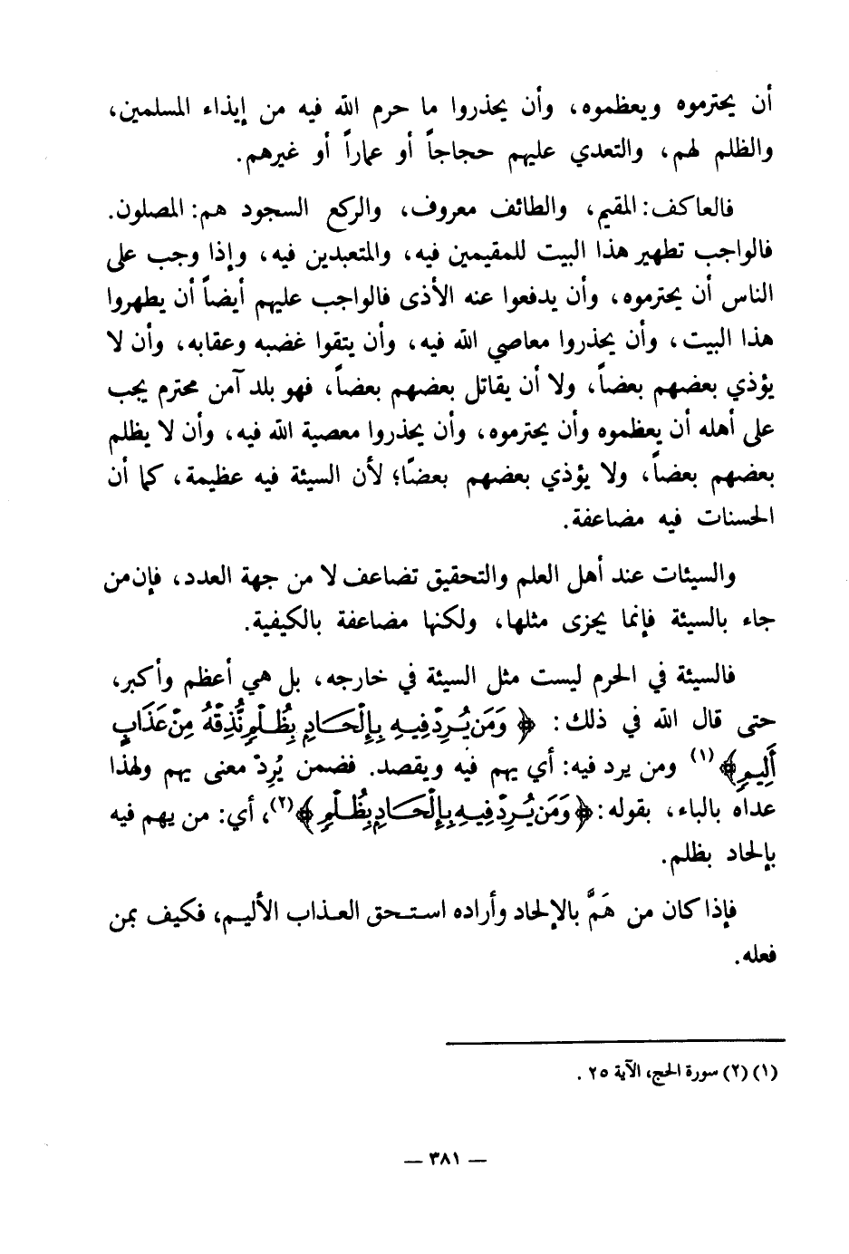 والسيئات عند أهل العلم والتحقيق تضاعف لا من جهة العدد، فإن من جاء بالسيئة فإنما يجزى مثلها، ولكنها مضاعفة بالكيفية، فالسيئة في الحرم ليست مثل السيئة في خارجه، بل هي أعظم وأكبر، حتى قال الله في ذلك: {وَمَنْ يُرِدْ فِيهِ بِإِلْحَادٍ بِظُلْمٍ نُذِقْهُ مِنْ عَذَابٍ أَلِيمٍ} (¬1) ومن يرد فيه: أي يهم فيه ويقصد. فضمن يرد معنى يهم ولهذا عداه بالباء، بقوله: {وَمَنْ يُرِدْ فِيهِ بِإِلْحَادٍ بِظُلْمٍ} (¬2) أي: من يهم فيه بإلحاد بظلم.