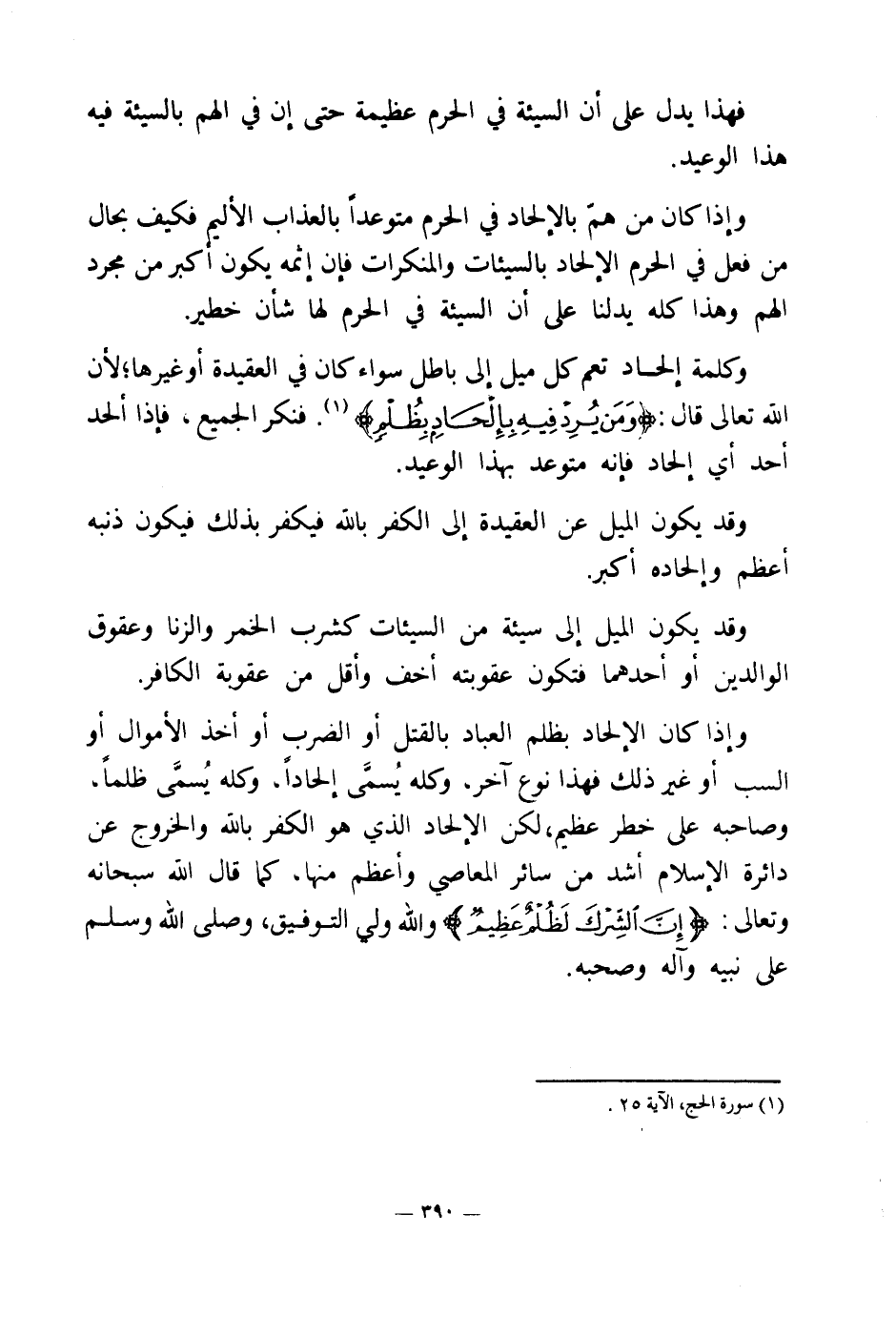 فهذا يدل على أن السيئة في الحرم عظيمة حتى إن في الهم بالسيئة فيه هذا الوعيد، وإذا كان من هم بالإلحاد في الحرم متوعدا بالعذاب الأليم فكيف بحال من فعل في الحرم الإلحاد بالسيئات والمنكرات فإن إثمه يكون أكبر من مجرد الهم، وهذا كله يدلنا على أن السيئة في الحرم لها شأن خطير، وكلمة إلحاد تعم كل ميل إلى باطل سواء كان في العقيدة أو غيرها؛ لأن الله تعالى قال: {وَمَنْ يُرِدْ فِيهِ بِإِلْحَادٍ بِظُلْمٍ} (¬1)