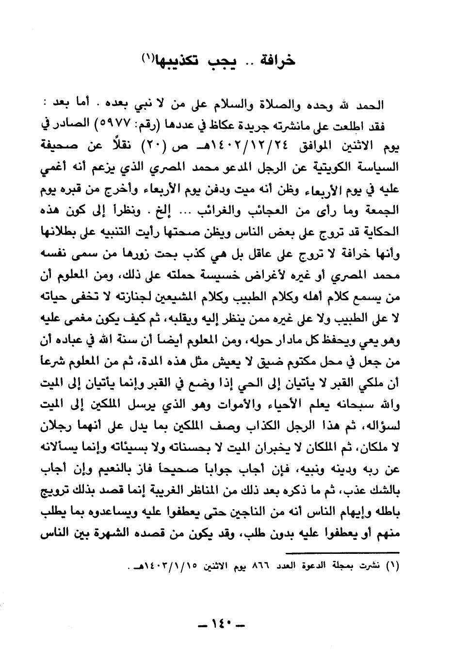 فقد اطلعت على ما نشرته جريدة عكاظ في عددها (رقم: 5977) الصادر في يوم الاثنين الموافق 24 \ 12 \ 1402هـ ص (20) نقلا عن صحيفة السياسة الكويتية عن الرجل المدعو محمد المصري الذي يزعم أنه أغمي عليه في يوم الأربعاء، وظن أنه ميت ودفن يوم الأربعاء وأخرج من قبره يوم الجمعة وما رأى من العجائب والغرائب. إلخ.