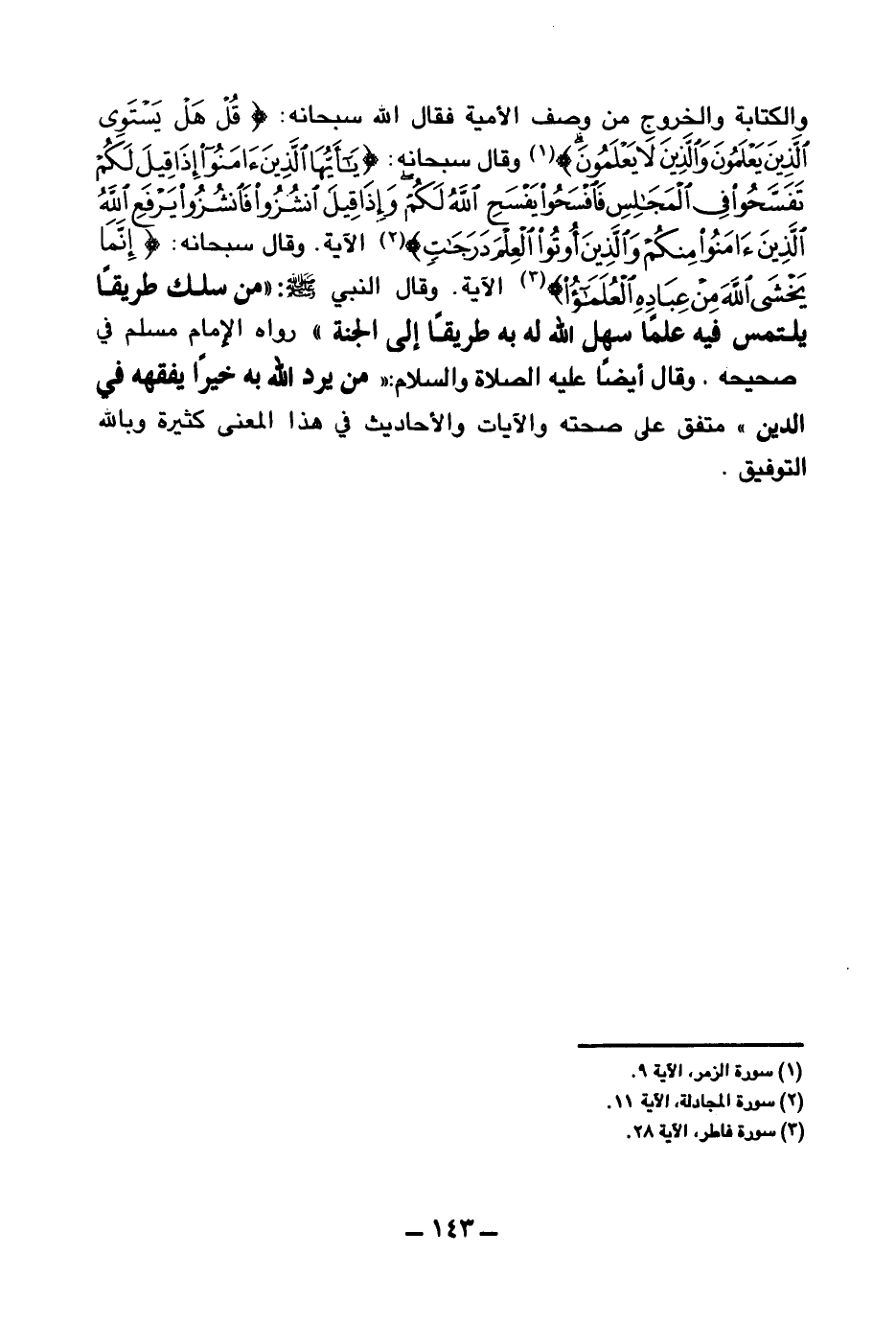 وقال سبحانه: {إِنَّمَا يَخْشَى اللَّهَ مِنْ عِبَادِهِ الْعُلَمَاءُ} (¬3) الآية. وقال النبي صلى الله عليه وسلم: «من سلك طريقا يلتمس فيه علما سهل الله له به طريقا إلى الجنة (¬4) » رواه الإمام مسلم في صحيحه. وقال أيضا عليه الصلاة والسلام: «من يرد الله به خيرا يفقهه في الدين (¬5) » متفق على صحته والآيات والأحاديث في هذا المعنى كثيرة وبالله التوفيق.