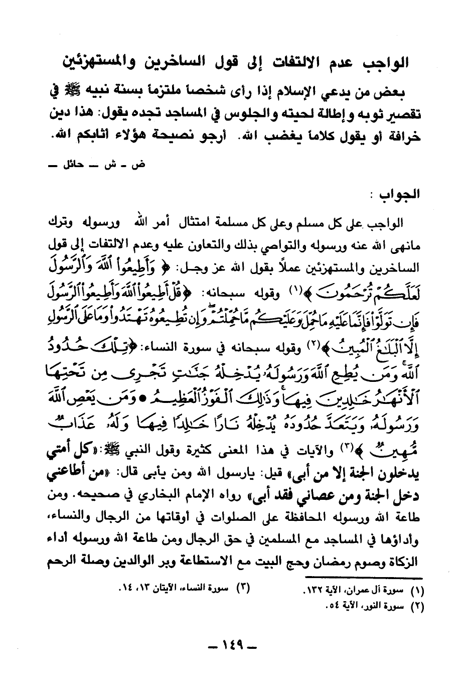 الجواب: الواجب على كل مسلم وعلى كل مسلمة امتثال أمر الله ورسوله وترك ما نهى الله عنه ورسوله والتواصي بذلك والتعاون عليه وعدم الالتفات إلى قول الساخرين والمستهزئين عملا بقول الله عز وجل: {وَأَطِيعُوا اللَّهَ وَالرَّسُولَ لَعَلَّكُمْ تُرْحَمُونَ} (¬1) وقوله سبحانه: {قُلْ أَطِيعُوا اللَّهَ وَأَطِيعُوا الرَّسُولَ فَإِنْ تَوَلَّوْا فَإِنَّمَا عَلَيْهِ مَا حُمِّلَ وَعَلَيْكُمْ مَا حُمِّلْتُمْ وَإِنْ تُطِيعُوهُ تَهْتَدُوا وَمَا عَلَى الرَّسُولِ إِلَّا الْبَلَاغُ الْمُبِينُ} (¬2) وقوله سبحانه في سورة النساء: {تِلْكَ حُدُودُ اللَّهِ وَمَنْ يُطِعِ اللَّهَ وَرَسُولَهُ يُدْخِلْهُ جَنَّاتٍ تَجْرِي مِنْ تَحْتِهَا الْأَنْهَارُ خَالِدِينَ فِيهَا وَذَلِكَ الْفَوْزُ الْعَظِيمُ} (¬3) {وَمَنْ يَعْصِ اللَّهَ وَرَسُولَهُ وَيَتَعَدَّ حُدُودَهُ يُدْخِلْهُ نَارًا خَالِدًا فِيهَا وَلَهُ عَذَابٌ مُهِينٌ} (¬4)