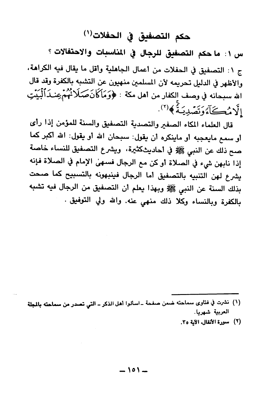 ج1: التصفيق في الحفلات من أعمال الجاهلية وأقل ما يقال فيه الكراهة، والأظهر في الدليل تحريمه؛ لأن المسلمين منهيون عن التشبه بالكفرة وقد قال الله سبحانه في وصف الكفار من أهل مكة {وَمَا كَانَ صَلَاتُهُمْ عِنْدَ الْبَيْتِ إِلَّا مُكَاءً وَتَصْدِيَةً} (¬2)