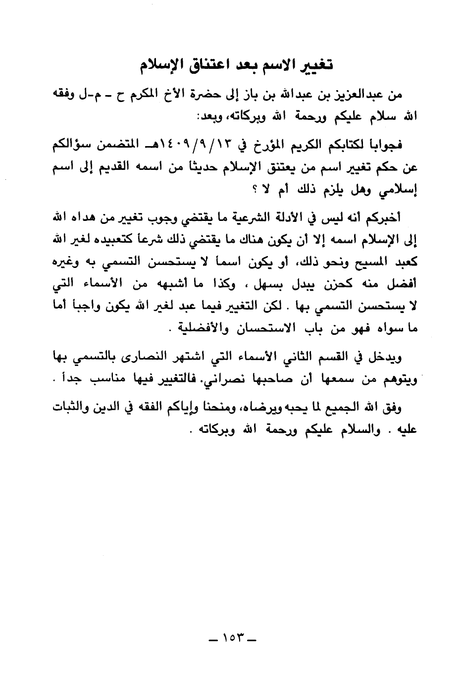 فجوابا لكتابكم الكريم المؤرخ في 13 \ 9 \ 1409هـ المتضمن سؤالكم عن حكم تغيير اسم من يعتنق الإسلام حديثا من اسمه القديم إلى اسم إسلامي وهل يلزم ذلك أم لا؟