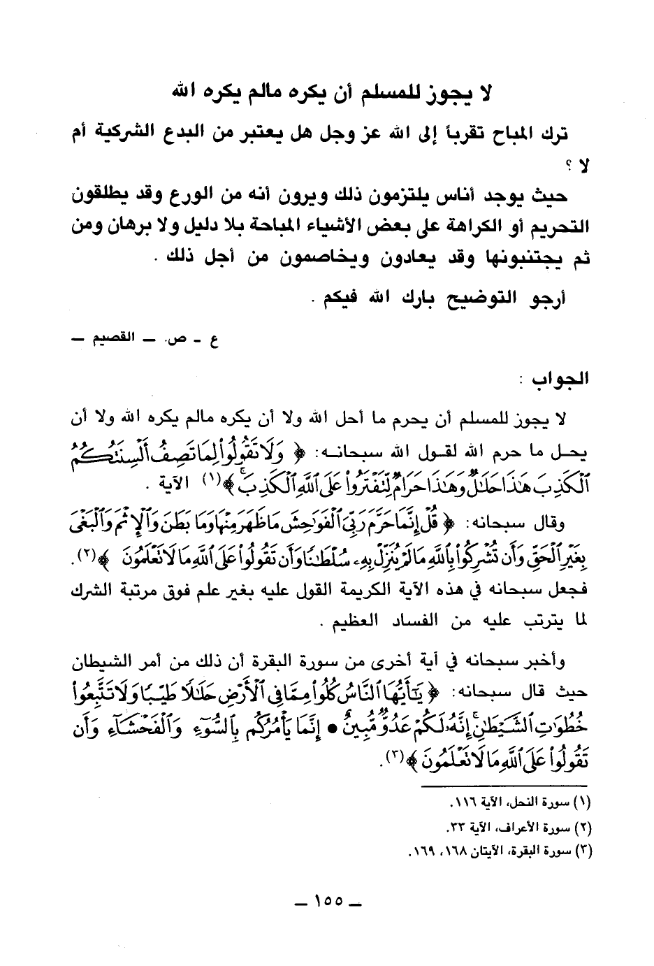 وقال سبحانه: {قُلْ إِنَّمَا حَرَّمَ رَبِّيَ الْفَوَاحِشَ مَا ظَهَرَ مِنْهَا وَمَا بَطَنَ وَالْإِثْمَ وَالْبَغْيَ بِغَيْرِ الْحَقِّ وَأَنْ تُشْرِكُوا بِاللَّهِ مَا لَمْ يُنَزِّلْ بِهِ سُلْطَانًا وَأَنْ تَقُولُوا عَلَى اللَّهِ مَا لَا تَعْلَمُونَ} (¬2)