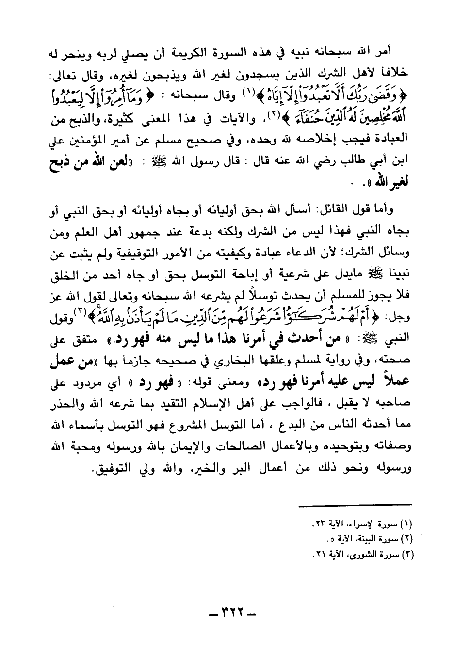 أمر الله سبحانه نبيه في هذه السورة الكريمة أن يصلي لربه وينحر له خلافا لأهل الشرك الذين يسجدون لغير الله ويذبحون لغيره، وقال تعالى: {وَقَضَى رَبُّكَ أَلَّا تَعْبُدُوا إِلَّا إِيَّاهُ} (¬1) وقال سبحانه: {وَمَا أُمِرُوا إِلَّا لِيَعْبُدُوا اللَّهَ مُخْلِصِينَ لَهُ الدِّينَ حُنَفَاءَ} (¬2) والآيات في هذا المعنى كثيرة، والذبح من العبادة فيجب إخلاصه لله وحده، وفي صحيح مسلم عن أمير المؤمنين علي بن أبي طالب رضي الله عنه قال: قال رسول الله صلى الله عليه وسلم: «لعن الله من ذبح لغير الله (¬3) » .