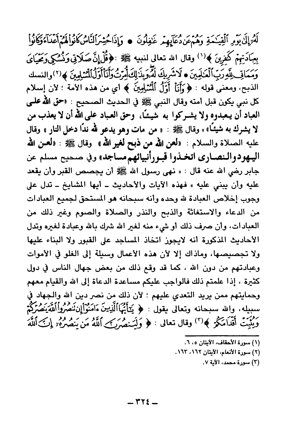 لأن إسلام كل نبي يكون قبل أمته وقال النبي صلى الله عليه وسلم في الحديث الصحيح: «حق الله على العباد أن يعبدوه ولا يشركوا به شيئا وحق العباد على الله أن لا يعذب من لا يشرك به شيئا (¬4) » وقال صلى الله عليه وسلم: «من مات وهو يدعو لله ندا دخل النار (¬5) » وقال عليه الصلاة والسلام: «لعن الله من ذبح لغير الله (¬6) » وقال صلى الله عليه وسلم: «لعن الله اليهود والنصارى اتخذوا قبور أنبيائهم مساجد (¬7) » وفي صحيح مسلم عن جابر رضي الله عنه قال: «نهى رسول الله صلى الله عليه وسلم أن يجصص القبر وأن يقعد عليه وأن يبنى عليه (¬8) » فهذه الآيات والأحاديث - أيها المشايخ - تدل على وجوب إخلاص العبادة لله وحده وأنه سبحانه هو المستحق لجميع العبادات من الدعاء والاستغاثة والذبح والنذر والصلاة والصوم وغير ذلك من العبادات، وأن صرف ذلك أو شيء منه لغير الله شرك بالله وعبادة لغيره وتدل الأحاديث المذكورة أنه لا يجوز اتخاذ المساجد على القبور ولا البناء عليها ولا تجصيصها، وما ذاك إلا لأن هذه الأعمال وسيلة إلى الغلو في الأموات وعبادتهم من دون الله، كما قد وقع ذلك من بعض جهال الناس في دول كثيرة، إذا علمتم ذلك فالواجب عليكم مساعدة الدعاة إلى الله والقيام معهم وحمايتهم ممن يريد التعدي عليهم؛ لأن ذلك من نصر دين الله والجهاد في سبيله، والله سبحانه وتعالى يقول: {يَا أَيُّهَا الَّذِينَ آمَنُوا إِنْ تَنْصُرُوا اللَّهَ يَنْصُرْكُمْ وَيُثَبِّتْ أَقْدَامَكُمْ} (¬9) وقال تعالى: