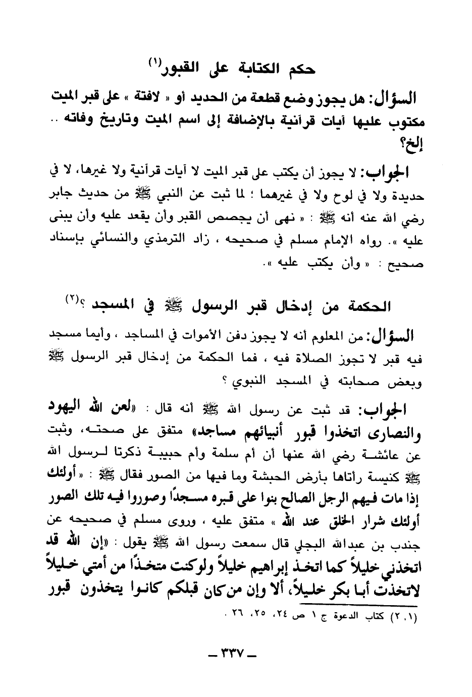 الجواب: قد ثبت عن رسول الله صلى الله عليه وسلم أنه قال: «لعن الله اليهود والنصارى اتخذوا قبور أنبيائهم مساجد (¬2) » متفق على صحته، وثبت عن عائشة رضي الله عنها «أن أم سلمة وأم حبيبة ذكرتا لرسول الله صلى الله عليه وسلم كنيسة رأتاها بأرض الحبشة وما فيها من الصور فقال صلى الله عليه وسلم: أولئك إذا مات فيهم الرجل الصالح بنوا على قبره مسجدا وصوروا فيه تلك الصور أولئك شرار الخلق عند الله (¬3) » متفق عليه،.