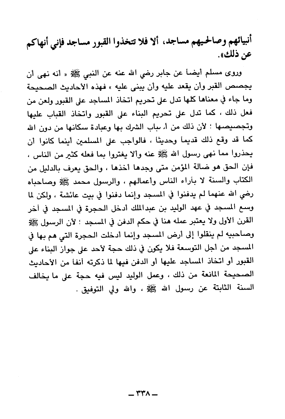 وصالحيهم مساجد ألا فلا تتخذوا القبور مساجد فإني أنهاكم عن ذلك (¬1) » وروى مسلم أيضا عن جابر رضي الله عنه عن النبي صلى الله عليه وسلم «أنه نهى أن يجصص القبر وأن يقعد عليه وأن يبنى عليه (¬2) » فهذه الأحاديث الصحيحة وما جاء في معناها كلها تدل على تحريم اتخاذ المساجد على القبور ولعن من فعل ذلك، كما تدل على تحريم البناء على القبور واتخاذ القباب عليها وتجصيصها لأن ذلك من أسباب الشرك بها وعبادة سكانها من دون الله كما قد وقع ذلك قديما وحديثا.